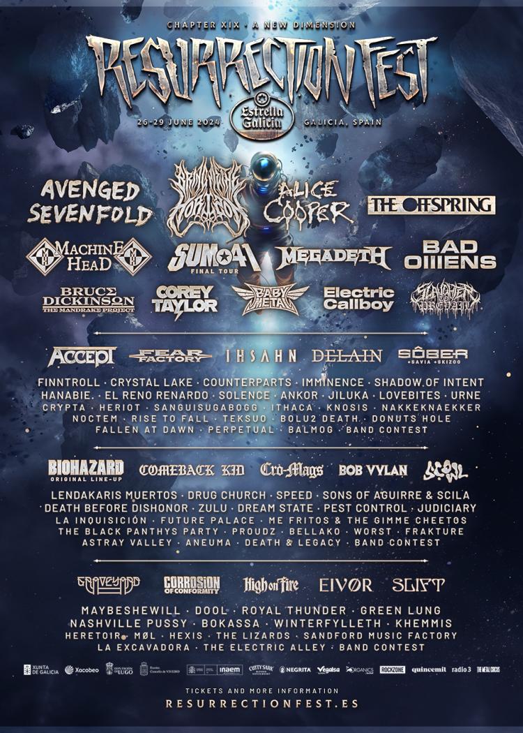 The lineup has been revealed for next year’s Resurrection Fest. The event will take place at Estrella Galicia in Viveiro, Spain on June 26-29 and it will feature: Accept, Alice Cooper, Aneuma, Ankor, Astray Valley, Avenged Sevenfold, Babymetal, Bad Omens, Balmog, Bellako, Biohazard, Bob Vylan, Bokassa, Bolu2 Death, Bring Me The Horizon, Bruce Dickinson, Comeback Kid, Corey Taylor, Corrosion of Conformity, Counterparts, Cro-Mags, Crypta, Crystal Lake, Death & Legacy, Death Before Dishonor, Delain, Donuts Hole, Dool, Dream State, Drug Church, Eivør, El Reno Renardo, Electric Callboy, Fallen At Dawn, Fear Factory, Finntroll, Frakture, Future Palace, Graveyard, Green Lung, Hanabie., Heretoir, Heriot, Hexis, High On Fire, Ihsahn, Imminence, Ithaca, Jiluka, Judiciary, Khemmis, Knosis, La Excavadora, La Inquisición, Lendakaris Muertos, Lovebites, MØL, Machine Head, Maybeshewill, Me Fritos And The Gimme Cheetos, Megadeth , Nakkeknaekker, Nashville Pussy, Noctem, Perpetual, Pest Control, Proudz, Rise to Fall, Royal Thunder, Slift, Sôber, Sandford Music Factory, Sanguisugabogg, Scowl, Shadow Of Intent, Slaughter To Prevail, Solence, Sons of Aguirre & Scila, Speed, Sum 41, Teksuo, The Black Panthys Party, The Electric Alley, The Lizards, The Offspring, Urne, Winterfylleth, Worst, and Zulu.