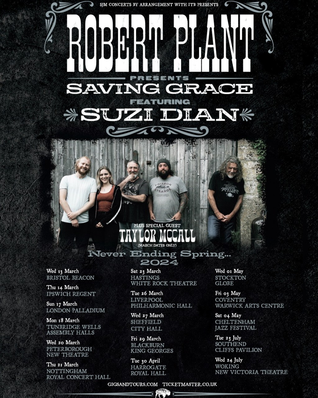 Robert Plant (Led Zeppelin) and his backing band Saving Grace (feat. Suzi Dian) have announced a headlining UK tour. Taylor McCall will open.