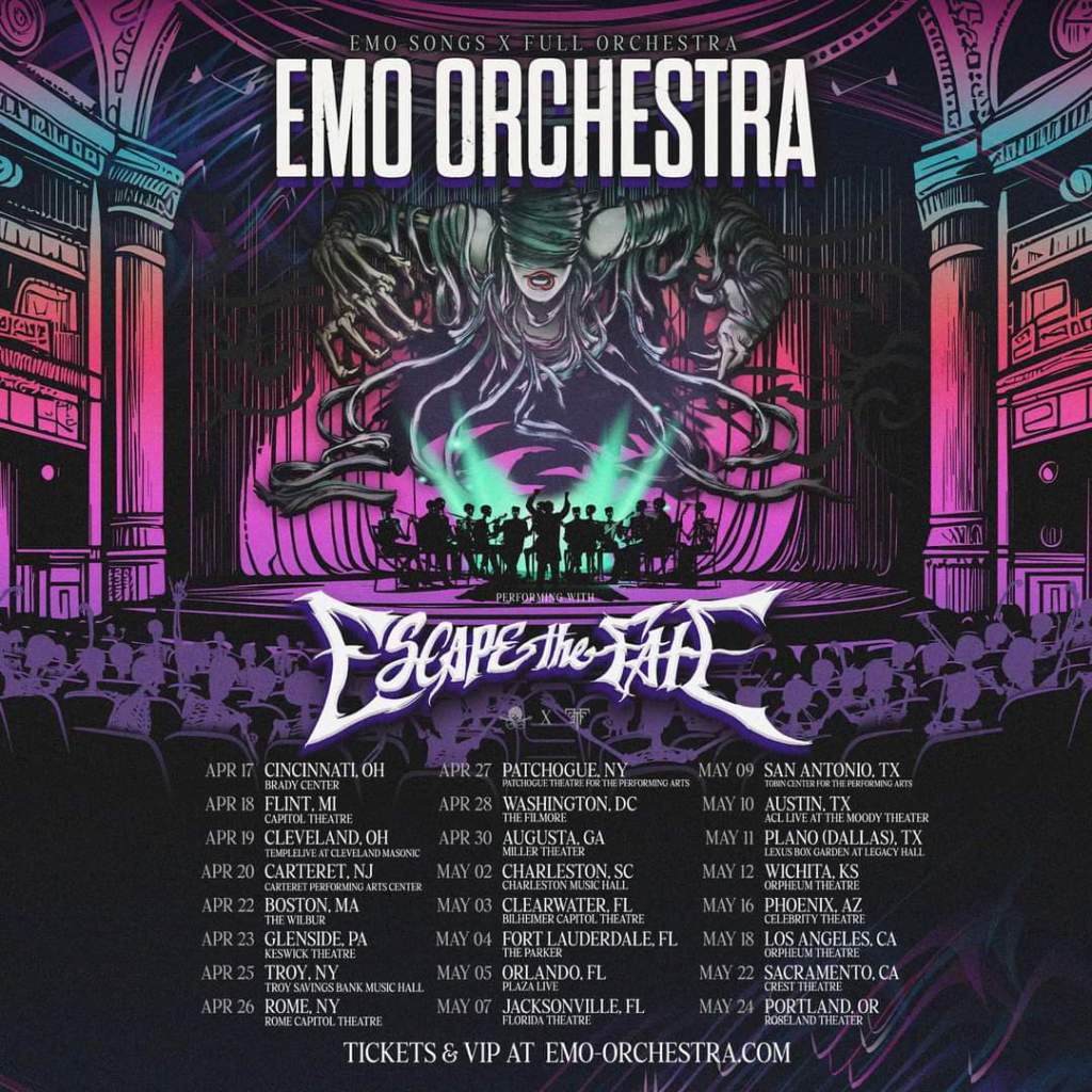 The Emo Orchestra will be joining forces with Escape The Fate for a spring U.S. tour. The trek will feature orchestral Escape The Fate shows consisting of emo anthems and original hit songs. Each date will include two 45-minute sets with a 15-minute intermission.