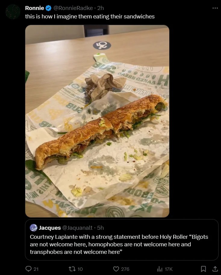 “If you gotta constantly talk about not being homophobic transphobic or a bigot as a band you are pandering, exploiting sexuality for your own benefit. The reality is most people arent homophobic or transphobic, so when I see bands constantly using it as a talking point it immediately shows me they can’t be trusted.”