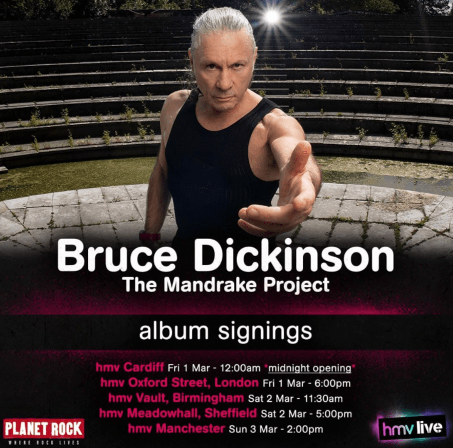 Bruce Dickinson (Iron Maiden) will be signing copies of his new album “The Mandrake Project” at HMV stores across the UK. More information can be found HERE. The dates can be found below: