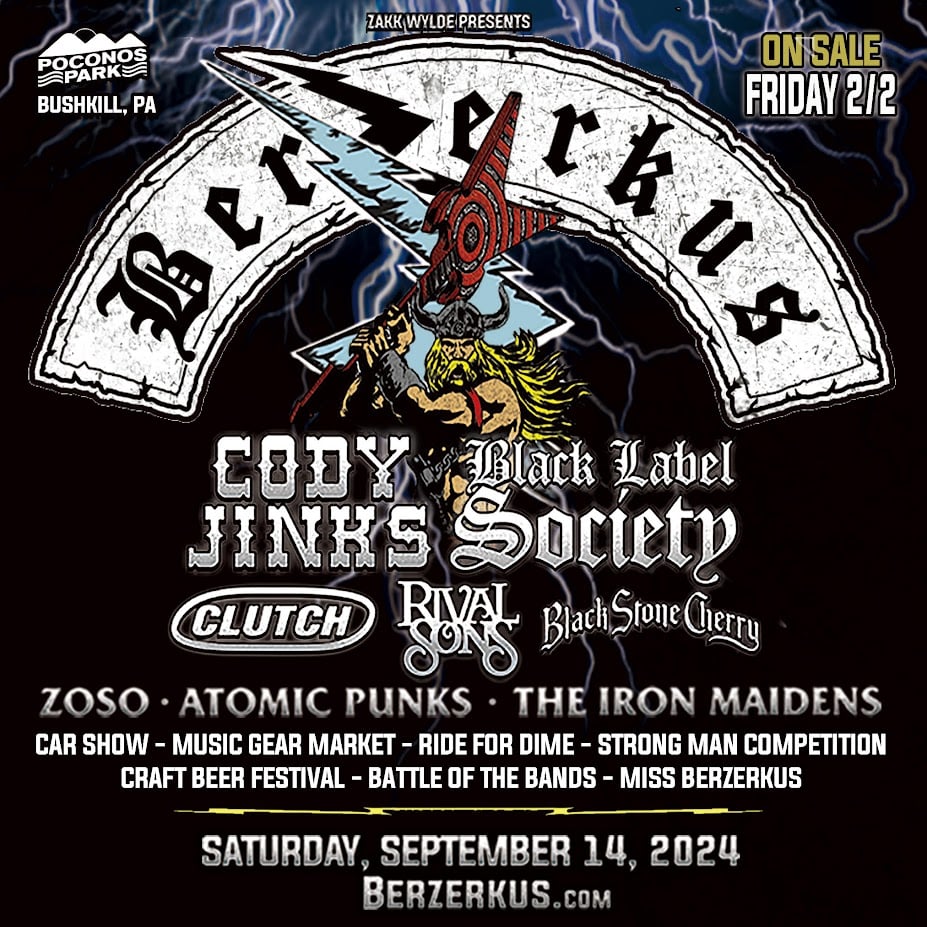 Zakk Wylde (Black Label Society, etc.) has revealed the details for his first-ever “Berzerkus” festival. The event will take place at Poconos Park in Bushkill, PA on September 14 and it will feature: Cody Jinks, Black Label Society, Clutch, Rival Sons, Black Stone Cherry, ZOSO (Led Zeppelin tribute), The Atomic Punks (Van Halen tribute), and The Iron Maidens (Iron Maiden tribute). In addition to music, the event will also include a car show, a music gear market, a strong man competition, a craft beer festival, a battle of the bands, a “Miss Berzerkus” contest, and a Ride For Dime Harley ride in honor of the late great Dimebag Darrell (Pantera).