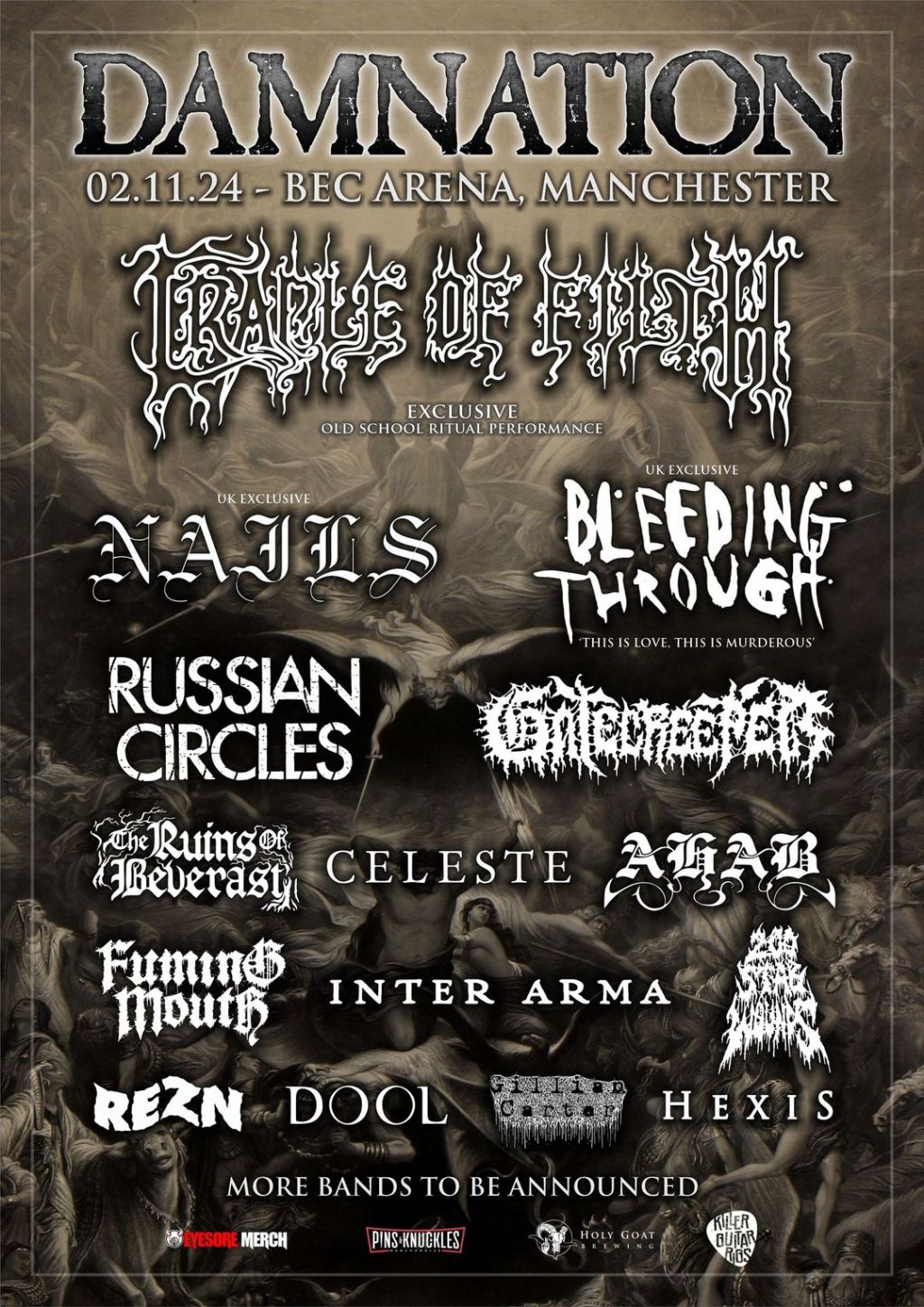 More bands have been added to this year’s Damnation Festival. The event will be held at BEC Arena in Manchester, UK on November 2 and it will now feature: Cradle Of Filth, Nails, Bleeding Through (performing “This Is Love, This Is Murderous“), Russian Circles, Gatecreeper, The Ruins Of Beverast, Celest, Ahab, Fuming Mouth, Inter Arma, 200 Stab Wounds, REZN, Dool, Gillian Carter, and Hexis.