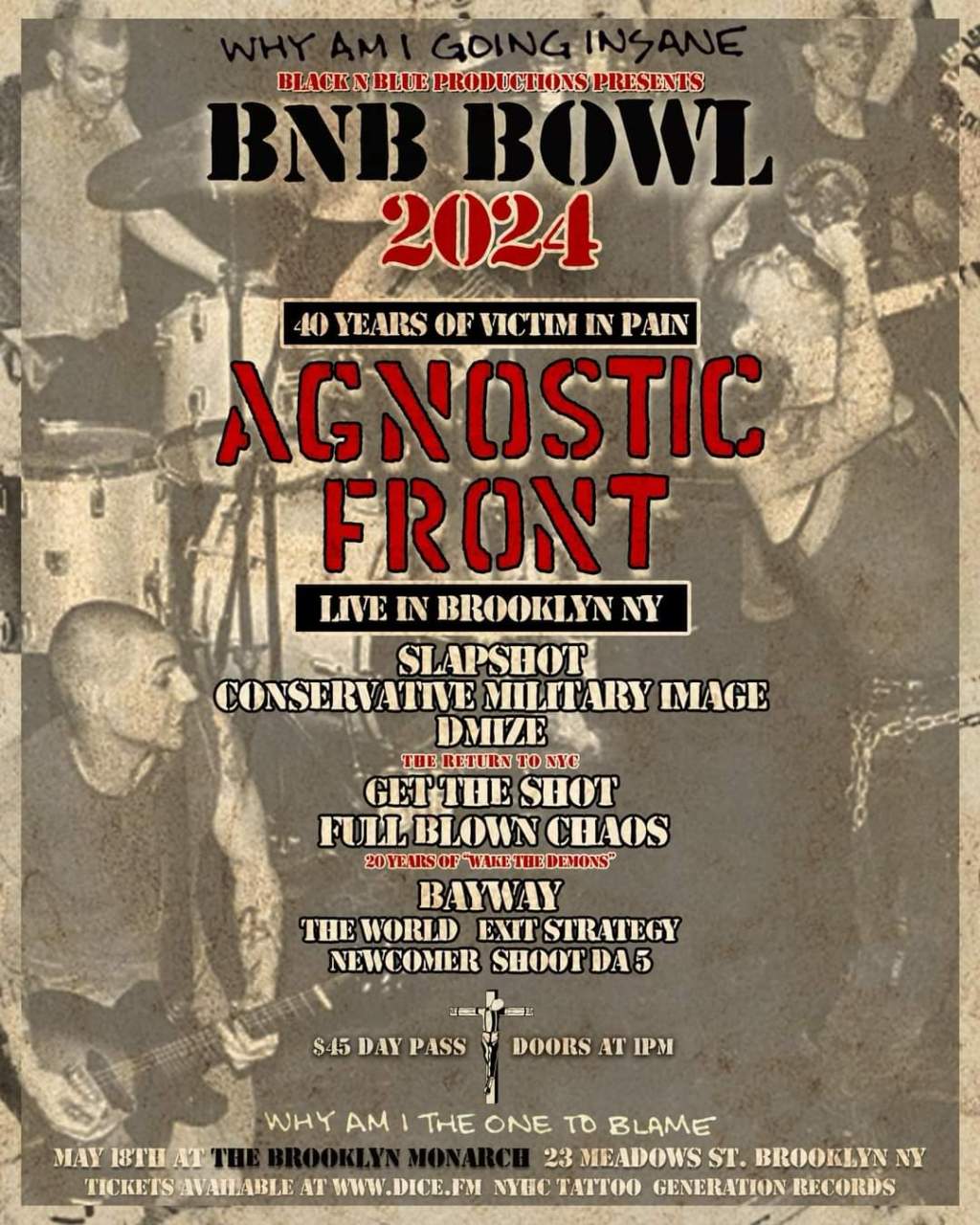 Agnostic Front will be performing “United Blood” and “Victim In Pain” in full during this year’s “BNB Bowl” festival. That event will take place at at the Brooklyn Monarch in Brooklyn, NY on May 18 and it will also feature: Slapshot, Conservative Military Image, DMIZE, Get The Shot, Full Blown Chaos (“Wake The Demons“ 20th anniversary set), Bayway, The World, Exit Strategy, Newcomer, and Shot Da 5.