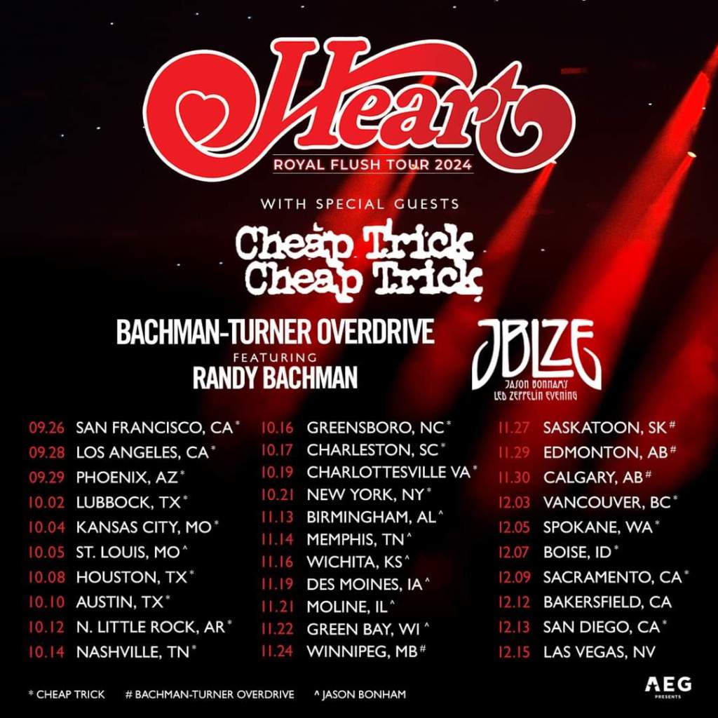 Heart have added a fall leg to their upcoming “Royal Flush” tour. Cheap Trick, Jason Bonham’s Led Zeppelin Evening and Bachman–Turner Overdrive will open on select dates.