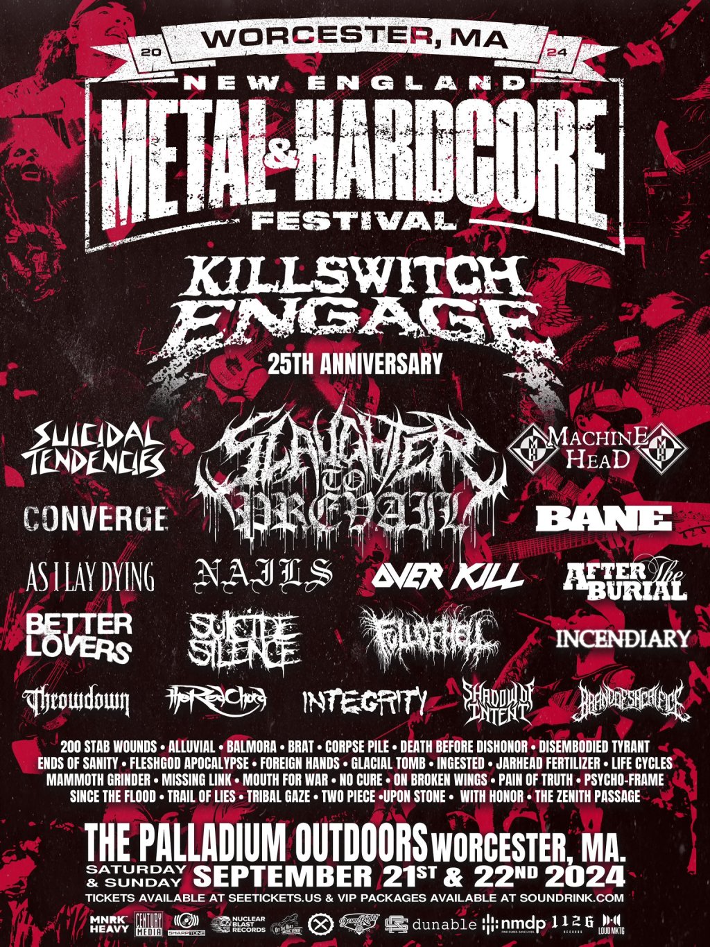 The lineup has been revealed for this year’s New England Metal & Hardcore Festival. The event will be held at The Palladium Outdoors in Worcester, MA on September 21-22 and it will feature performances from the following (in alphabetical order): 200 Stab Wounds, After The Burial, Alluvial, As I Lay Dying, Balmora, Bane, Better Lovers, Brand Of Sacrifice, Brat, Converge, Corpse Pile, Death Before Dishonor, Disembodied Tyrant, Ends Of Sanity, Fleshgod Apocalypse, Full of Hell, Incendiary Integrity, Jarhead Fertilizer, Killswitch Engage, Life Cycles, Machine Head, Mammoth Grinder, Missing Link, Mouth For War, Nails, No Cure, On Broken Wings, Overkill, Pain Of Truth, Psycho Frame, Shadow of Intent, Simulakra, Since The Flood, Slaughter To Prevail, Suicidal Tendencies, Suicide Silence, The Red Chord, The Zenith Passage, Throwdown, Trail Of Lies, Tribal Gaze, Two Piece, Upon Stone, and With Honor.