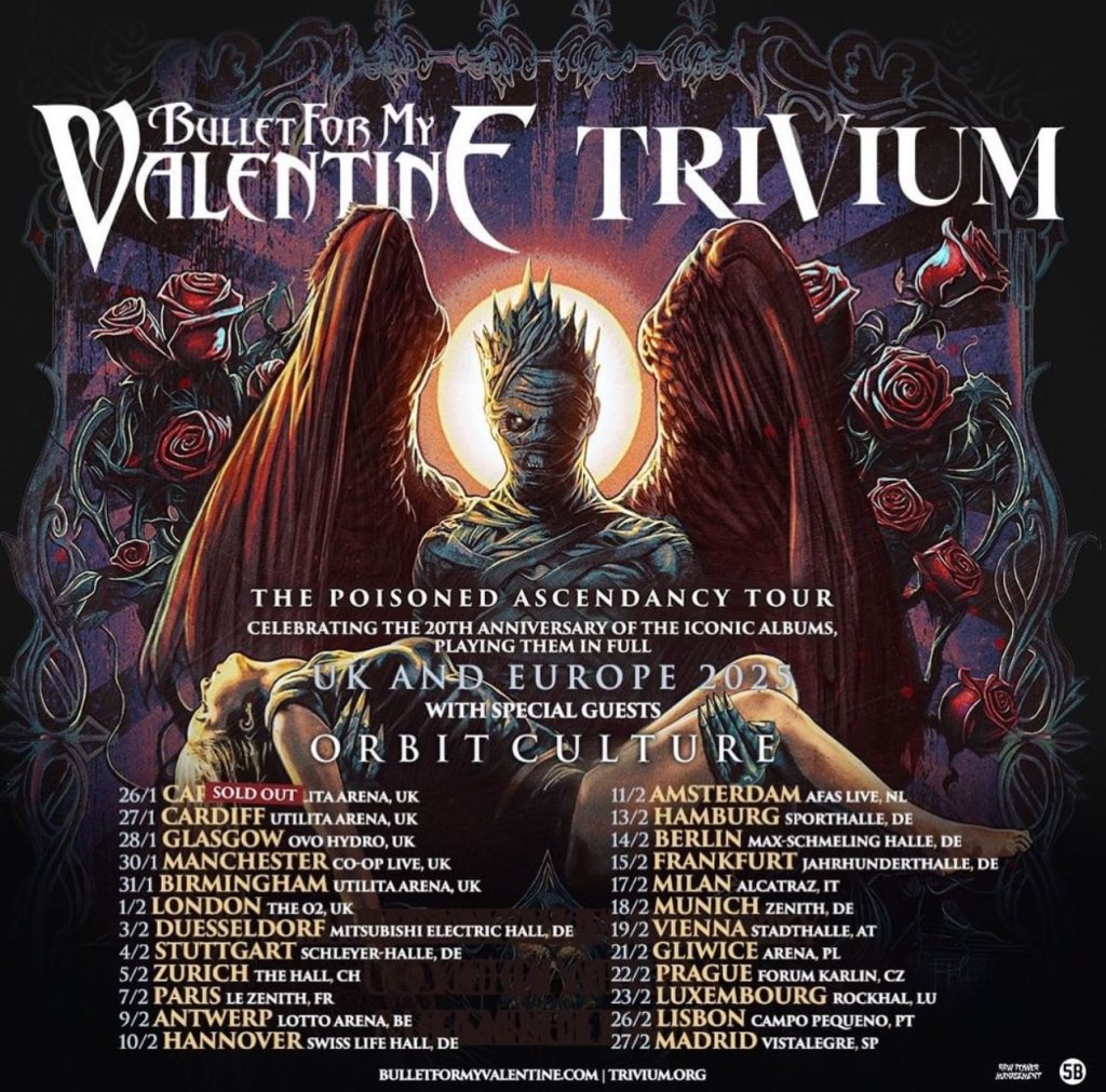 Bullet For My Valentine and Trivium have added a European leg to their “Poisoned Ascendancy Tour.” That trek will find Bullet For My Valentine performing “The Poison” in full and Trivium performing “Ascendancy” in full to commemorate their 20th anniversaries. Orbit Culture will open.
