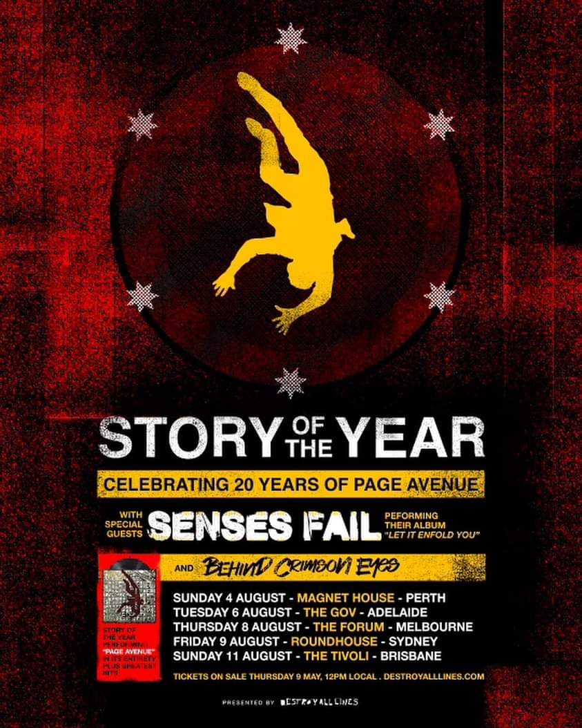 Story Of The Year have announced the Australian leg of their “Page Avenue” 20th anniversary tour. Senses Fail (playing “Let It Enfold You”) and Behind Crimson Eyes will open. Here’s the dates: