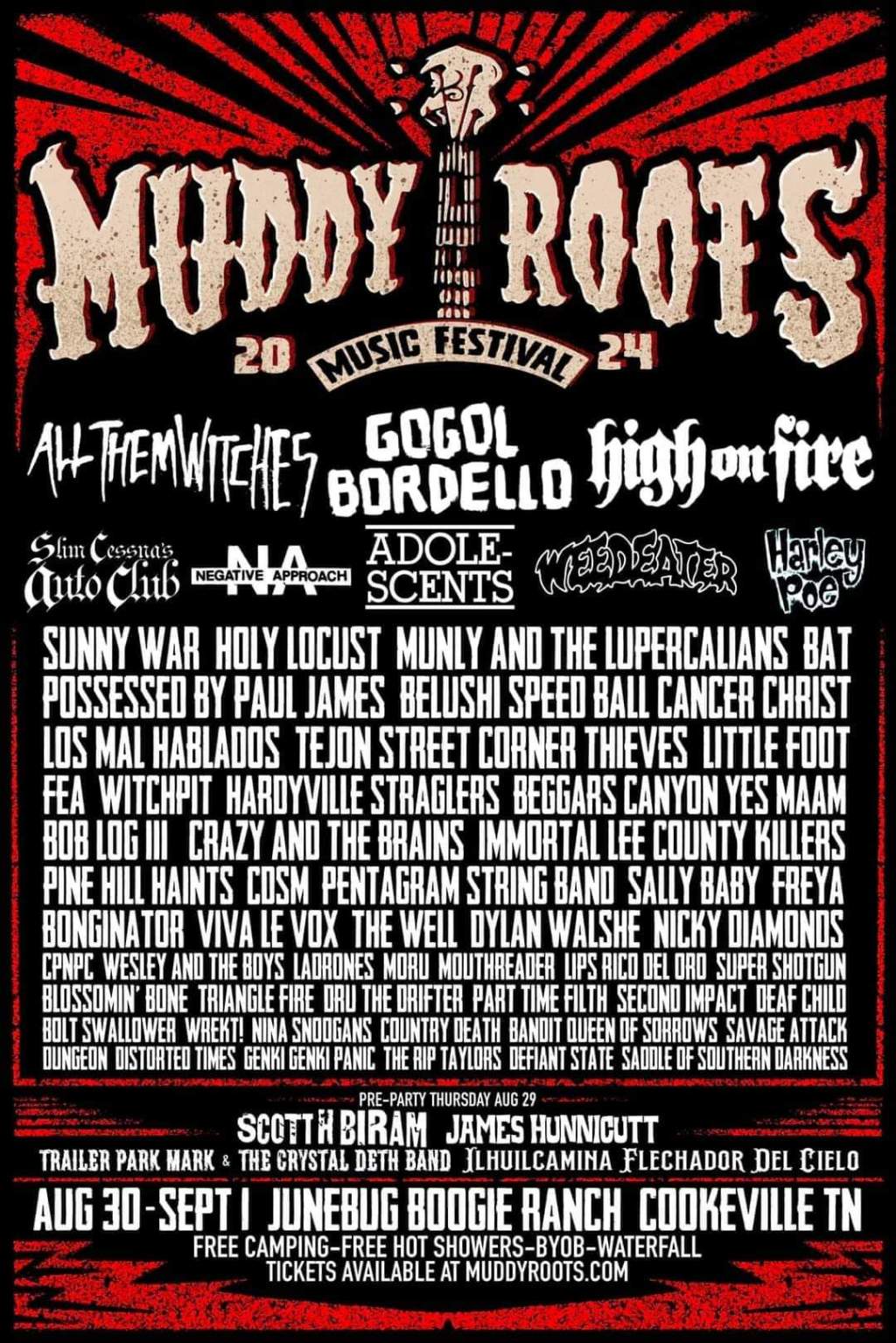 The lineup has been revealed for this year’s Muddy Roots Music Festival. The event will take place at the Junebug Boogie Ranch in Cookeville, TN on August 30 to September 1 and it will feature the following: All Them Witches, Gogol Bordello, High On Fire, Slim Cessna’s Auto Club, Negative Approach, Adolescents, Weedeater, Harley Poe, Sunny War, Holy Locust, Munly & The Lupercalians, Bat, Possessed By Paul James,Belushi Speedball, Cancer Christ, Los Mal Hablados, Tejon Street Corner Thieves, Little Foot, Feature, Witchpit, Hardyville Straglers, Beggars Canyon, Yes Maam, Bob Log III, Crazy And The Brains, Immortal Lee County Killers, Pine Hill Haints, COSM, Pentagram, String Band, Sally Baby, Freya, Bonginator, Viva Le Vox, The Well, Dylan Walshe, Nicky Diamonds, CPNPC, Wesley And The Boys, Ladrones, MORU, Mouth Reader, Lips, Rico Del Oro, Super Shotgun, Blossomin’ Bone, Triangle Fire, Dru The Drifter, Part Time Filth, Second Impact, Deaf Child, Bolt Swallower, Wrekt!, Nina Snoogans, Country Death, Bandit Queen Of Sorrows, Savage Attack, Dungeon, Distorted Times, Genki Genki Panic, The Rip Taylors, Defiant State, and Saddle Of Southern Darkness.