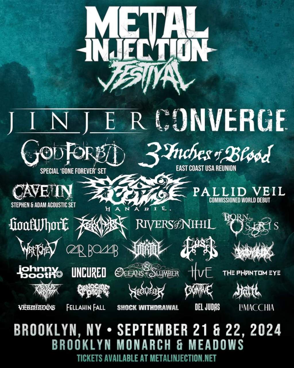 The lineup has been revealed for this year’s Metal Injection festival. The event will take place at the Brooklyn Monarch and Meadows in Brooklyn, NY on September 21-22 and it will feature the following: Jinjer, Converge, God Forbid (performing “Gone Forever”), 3 Inches Of Blood, Hanabie., Cave In (Stephen Brodsky & Adam McGrath acoustic set), Rivers Of Nihil, Revocation, Goatwhore, Pallid Veil, Oceans Of Slumber, Car Bomb, Bodybox, Gost, Born Of Osiris, Wretched, Jesus Wept, Hath, Cognitive, Vitriol, Phantom Eye, Necrofier, Genocide Pact, Shock Withdrawal, Johnny Booth, Uncured, Hue, Lamacchia, Del Judas, Vermin Dog, and Fellhin Fall. Metal Injection’s Frank Godla commented: