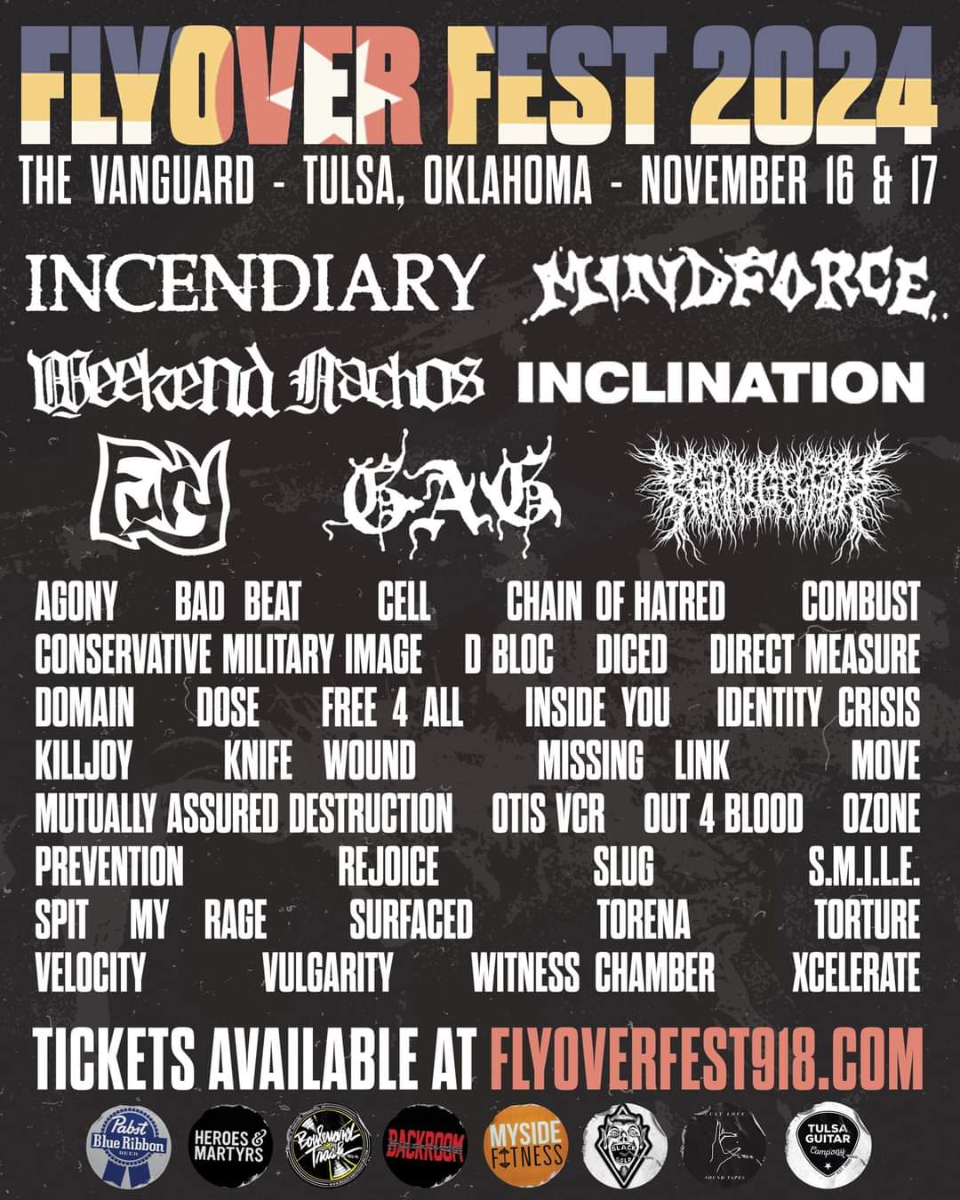 The lineup has been revealed for this year’s Flyover Fest. The event will take place at The Vanguard in Tulsa, OK on November 16-17 and it will feature: Incendiary, Mindforce, Weekend Nachos, Inclination, Fury, GAG, PeelingFlesh, Agony, Bad Beat, Cell, Chain Of Hatred, Combust, Conservative Military Image, D Bloc, Diced, Direct Measure, Domain, Dose, Free 4 All, Inside You, Identity Crisis, Killjoy, Knife Wound, Missing Link, Move, Mutually Assured Destruction, Otis VCR, Out 4 Blood, Ozone, Prevention, Rejoice, Slug, S.M.I.L.E., Spit My Rage, Surfaced, Toerna, Torture, Velocity, Vulgarity, Witness Chamber, and Xcelerate.