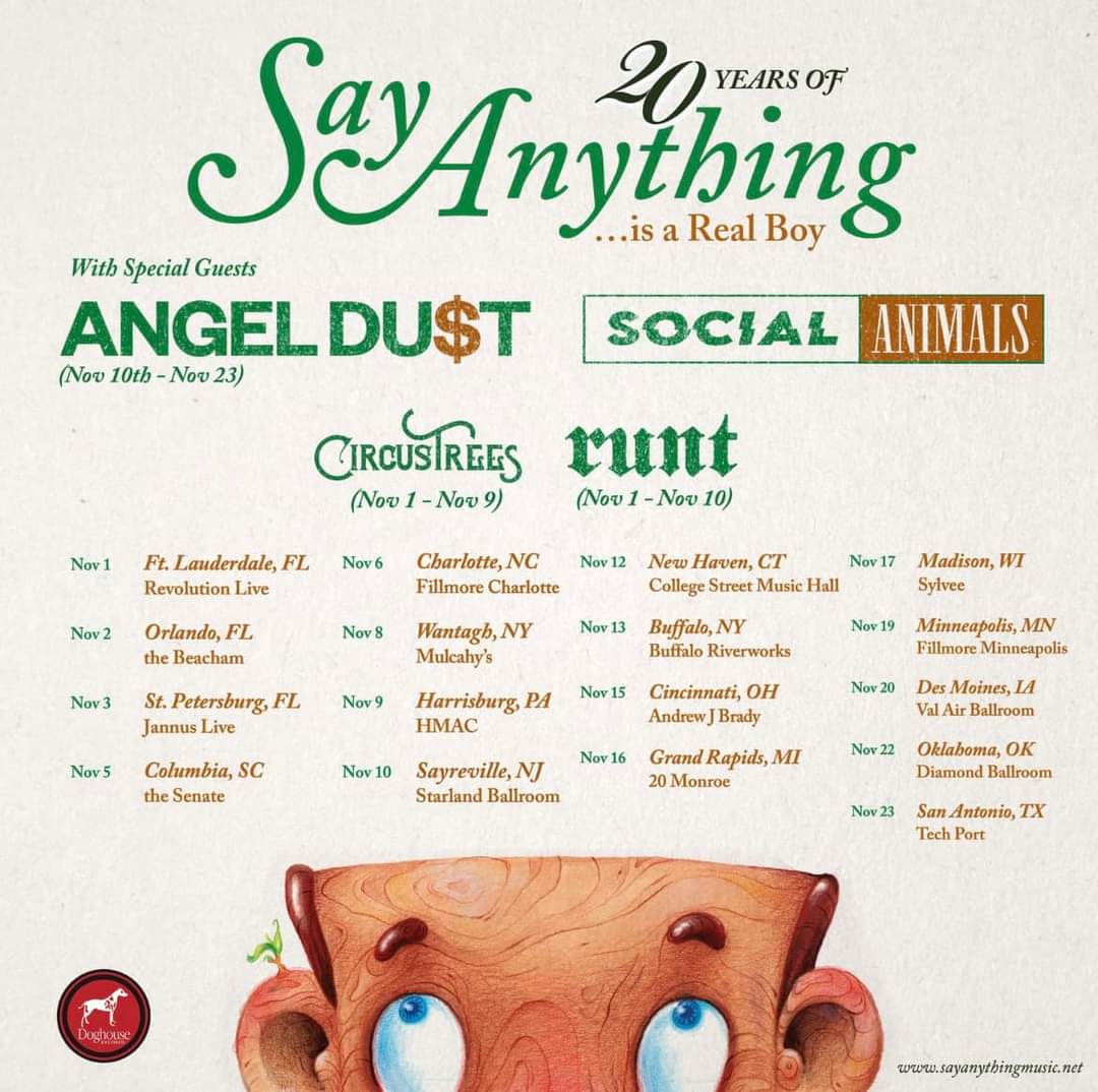 Say Anything have added another leg to their “…Is A Real Boy” 20th anniversary tour. Angel Du$t, Social Animals, Circus Trees, and Runt will open on select dates.