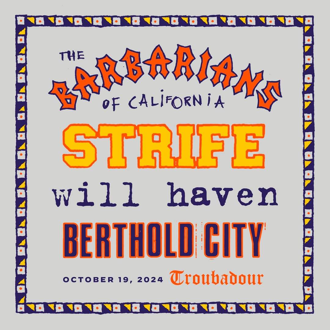 The Barbarians Of California, Strife, Will Haven and Berthold City will be performing at the Troubadour in West Hollywood, CA on October 19. Artist pre-sales are available now, with a general sale scheduled for August 2 at 10:00am PDT.