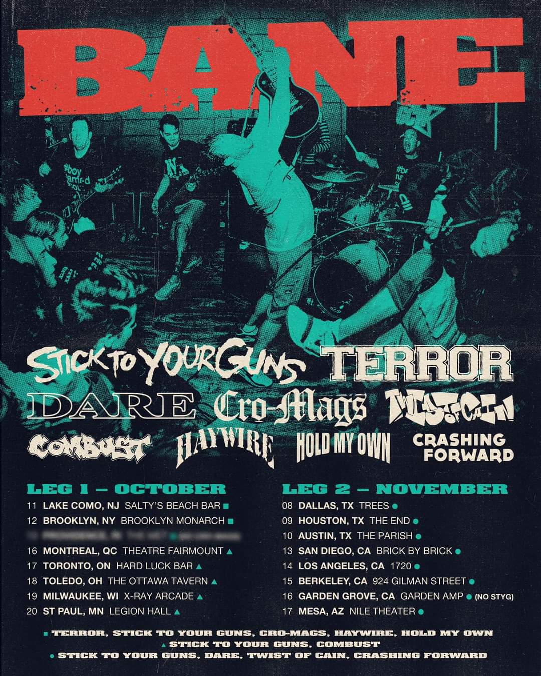 Bane have announced a headlining North American tour. Terror, Stick To Your Guns, Cro-Mags, Dare, Haywire, Combust, Twist Of Cain, Hold My Own, and Crashing Forward will serve as support on select dates.