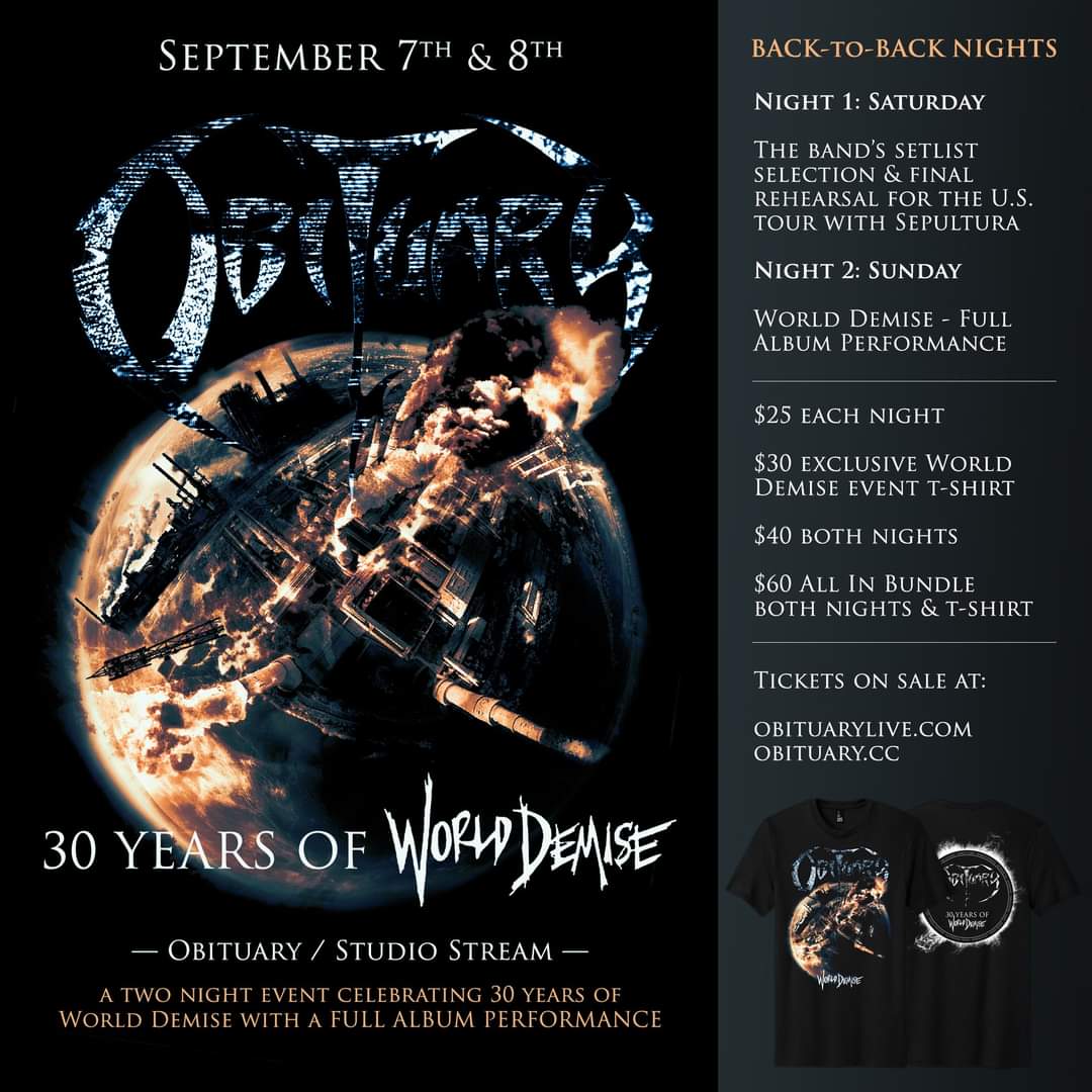 “We are super excited and want to invite all our fans around the World to join us September 7th & 8th (5pm EST) as we celebrate the 30 year anniversary of World Demise as we go “LIVE” from RedNeck Studio in Florida and bring you Back-to-Back Nights of Obituary Classics and World Demise Full Album Performance!!”