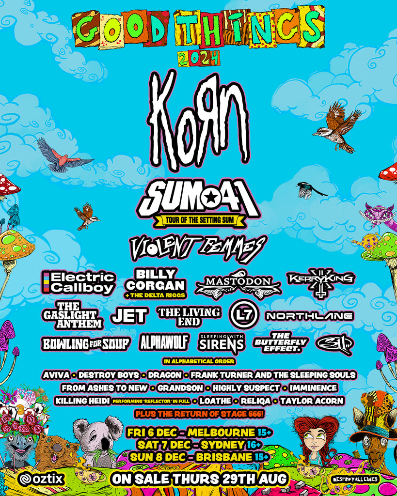 The lineup has been revealed for this year’s Good Things Festival. The event will take place in Australia this December and it will feature the following: Korn, Sum 41, Violent Femmes, Electric Callboy, Billy Corgan (with The Delta Riggs), Mastodon, Kerry King, The Gaslight Anthem, Jet, The Living End, L7, Northlane, Bowling For Soup, Alpha Wolf, Sleeping With Sirens, The Butterfly Effect, 311, AViVA, Destroy Boys, Dragon, Frank Turner And The Sleeping Souls, From Ashes To New, Grandson, Highly Suspect, Imminence, Killing Heidi (performing “Reflector”), Loathe, Reliqa, and Taylor Acorn. Here’s the dates: