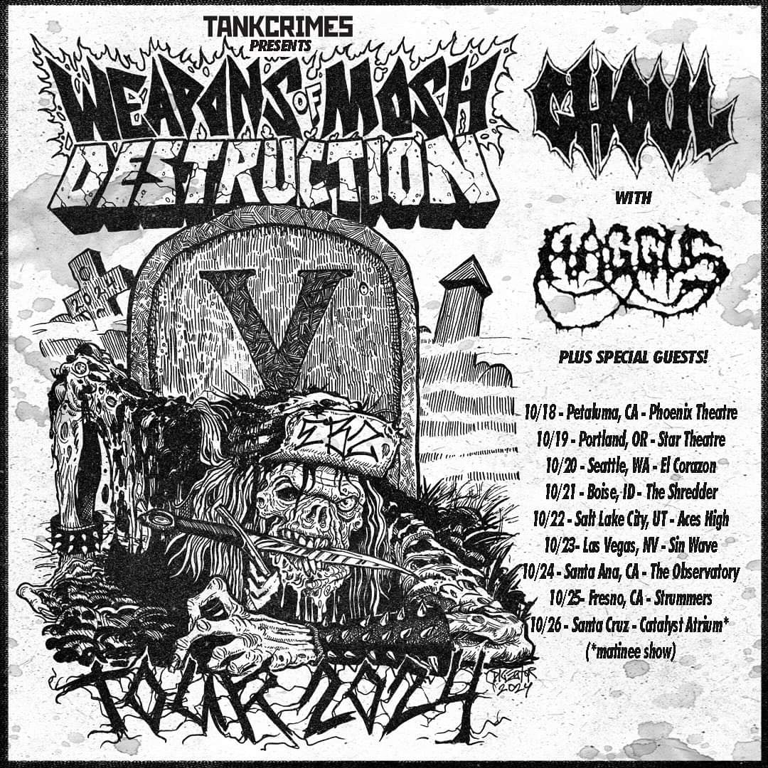“Attention gore lords, splatter hounds, and mince mongers! It’s been four long and dreary years since we’ve done a proper tour of our favorite coast… so it’s about time we do it right for all you West Coast knuckle draggers! We proudly announce we have teamed up with the almighty Ghoul — straight out of Creepsylvania — to bring you the most ignorant tour package of the decade! See you thrash-blasting grind freaks in the pit!”