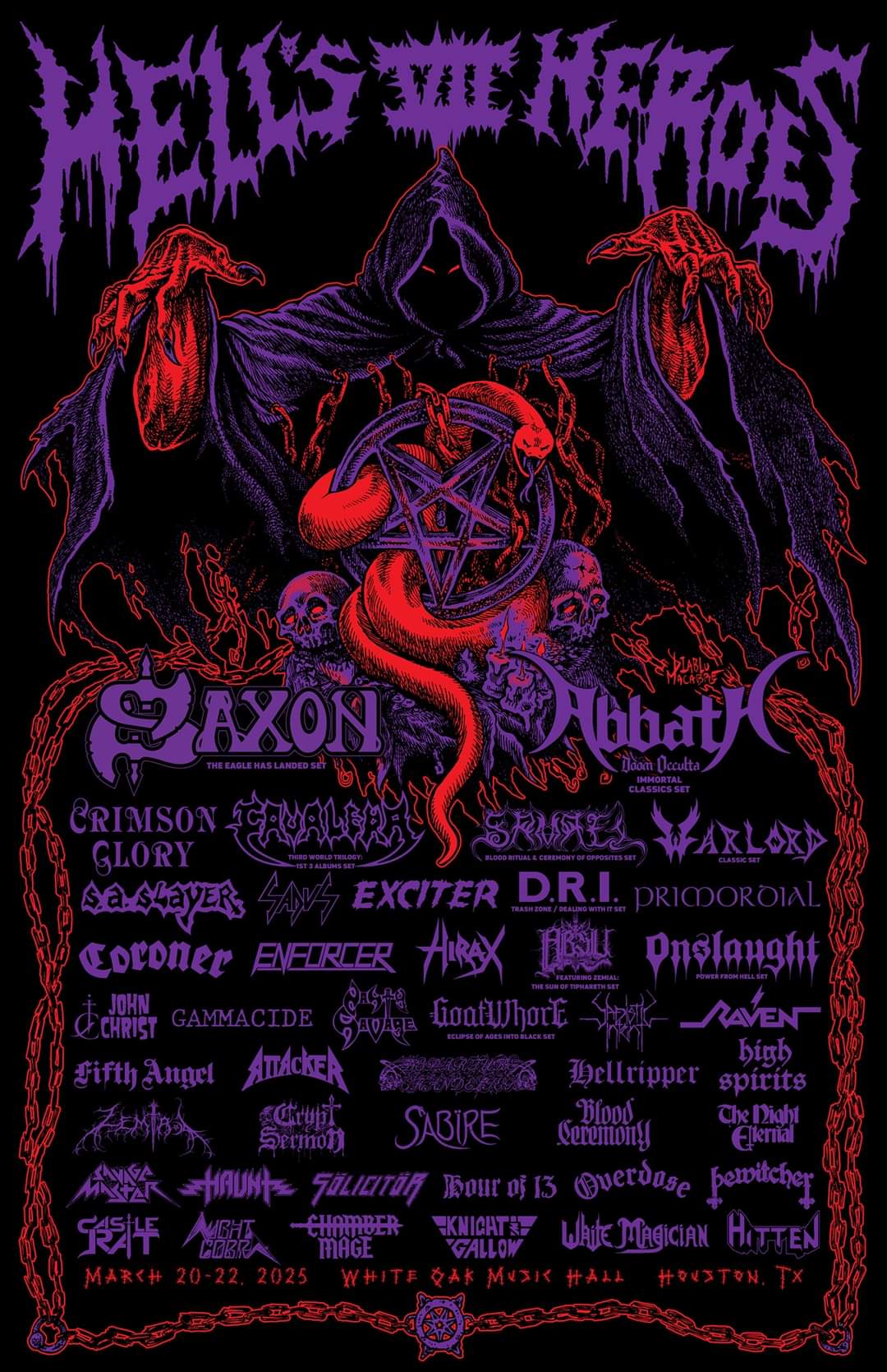 More bands have been added to next year’s Hell’s Heroes Festival. The event will take place at the White Oak Music Hall in Houston, TX on March 20-22 and it will now feature performances from the following: Saxon (“The Eagle Has Landed” set), Abbath (Immortal classics set), Samael (“Blood Ritual” and “Ceremony of Opposites” set), Crimson Glory, Warlord (classic set), Cavalera (songs from first three Sepultura albums), SA Slayer, Sadus, Coroner, Exciter, Absu (feat. Zemial: “The Sun Of Tiphareth” set), Gammacide, D.R.I. (“Dealing With It” and “Thrash Zone“ set), Hirax, Enforcer, Fifth Angel, Onslaught (“Power From Hell” set), Primordial, Hellripper, Nasty Savage, Goatwhore (‘Eclipse Of Ages Into Black” set), Savage Master, Crypt Sermon, Zemial, Raven, Blood Ceremony, John Christ, Departure Chandelier, Sadistic Intent, Bewitcher, Attacker, Solicitor, High Spirits, Sabire, Haunt, Hitten, Castle Rat, Chamber Mage, Knight & Gallow, Night Cobra, The Night Eternal, Hour Of 13, and Overdose, and White Magician.