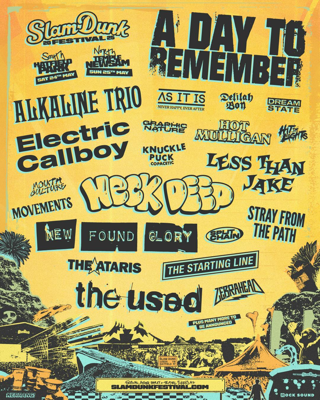 The initial lineup has been revealed for next year’s Slam Dunk Festival. The event, which will take place at Hatfield Park in Hatfield, UK on May 24 and at Temple Newsam in Leeds, UK on May 25, will feature: A Day To Remember, Electric Callboy, Alkaline Trio, Neck Deep, The Used, New Found Glory, The Starting Line, Less Than Jake, Hot Mulligan, As It Is, Knuckle Puck, Delilah Bon, Hit The Lights, Zebrahead, Dream State, Graphic Nature, Movements, Split Chain, The Ataris, Stray From The Path, and Mouth Culture.