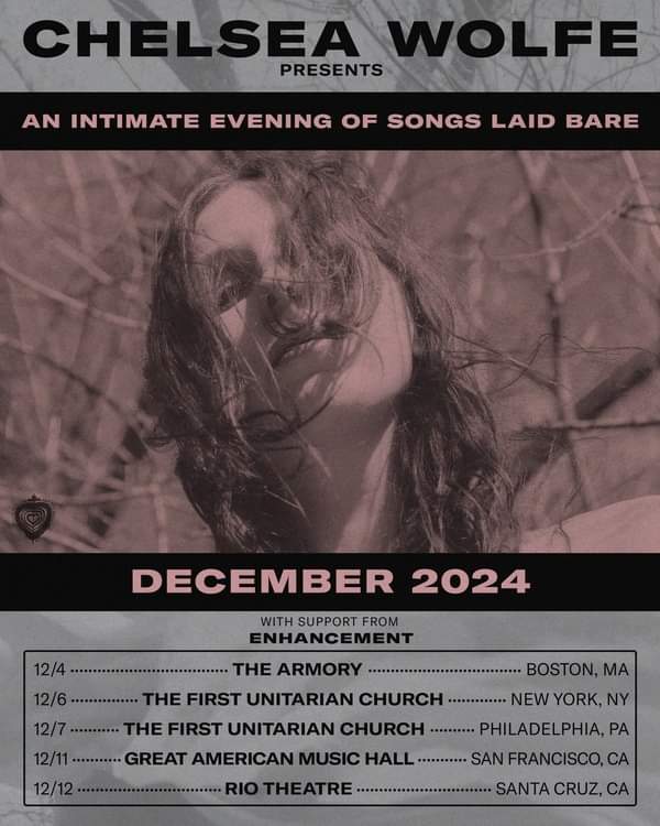 Chelsea Wolfe has announced a December headlining tour with Enhancement. The trek will find her performing stripped-back versions of songs from her catalog. Here’s the dates: