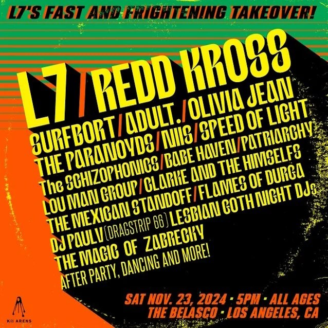 L7 have revealed the details for their first-ever “Fast And Frightening Takeover” event. The festival will take place at The Belasco in Los Angeles, CA on November 23 and it will feature: L7, Redd Kross, Surfbort, The Paranoyds, Adult., Oliva Jean, The Schizophonics, Speed Of Light, Niis, Patriarchy, Lou Man Group, Clarke And The Himselfs, Flames Of Durga, The Mexican Standoff, “Magic Castle” Magician Zabrecky, Paul V (Drag 66), and the Lesbian Goth Night DJs. L7’s Donita Sparks commented: