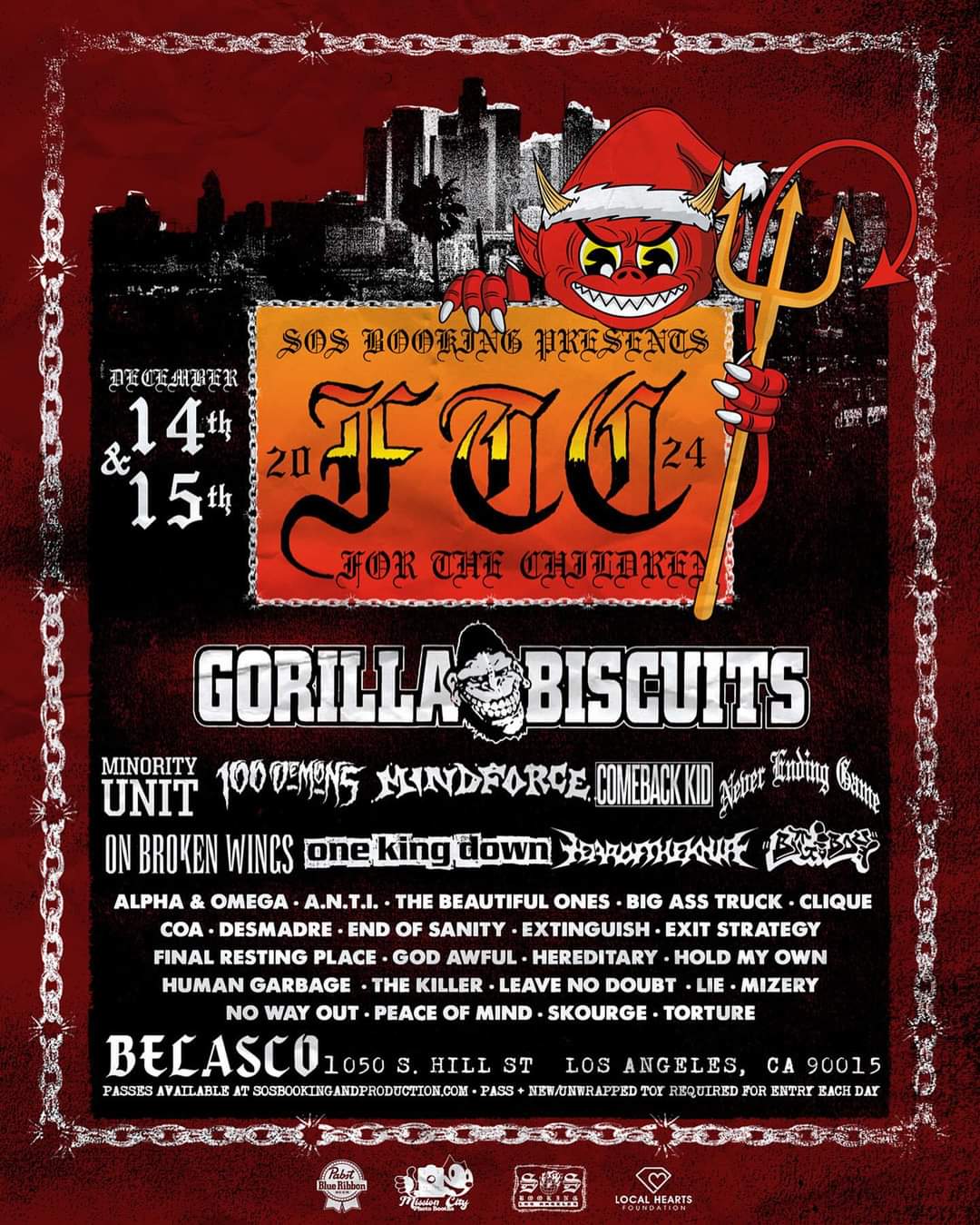 More bands have been added to this year’s For The Children Festival. That event will take place at The Belasco in Los Angeles, CA on December 14-15 and it will now feature the following: Gorilla Biscuits, Minority Unit, 100 Demons, Mindforce, Comeback Kid, Never Ending Game, On Broken Wings, One King Down, Year Of The Knife, Big Boy, Alpha & Omega, A.N.T.I., The Beautiful Ones, Big Ass Truck, Clique, Colin Of Arabia, Desmadre, End Of Sanity, Extinguish, Exit Strategy, Final Resting Place, God Awful, Hereditary, Holy My Own, Human Garbage, The Killer, Leave No Doubt, LIE, Mizery, No Way Out, Peace Of Mind, Skourge, and Torture.