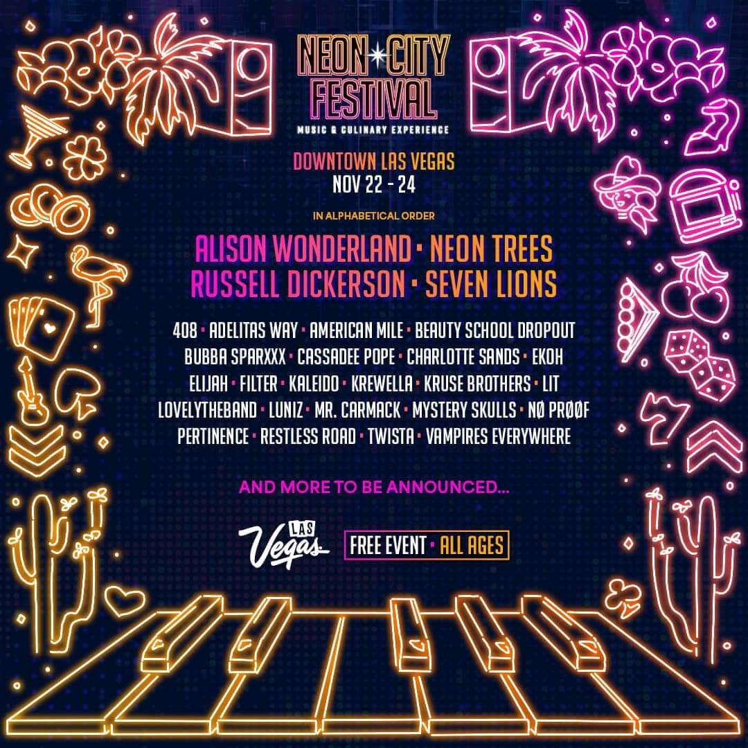 The initial lineup has been revealed for the inaugural Neon City Festival. The event will take place in downtown Las Vegas on November 22-24 and it will feature the following: Alison Wonderland, Neon Trees, Russell Dickerson, Seven Lions, 408, Adelitas Way, American Mile, Beauty School Dropout, Bubba Sparxxx, Cassadee Pope, Charlotte Sands, Ekoh, elijah, Filter, Kaleido, Krewella, Kruse Brothers, Lit, lovelytheband, Luniz, Mr. Carmack, Mystery Skulls, NO PROOF, Pertinence, Restless Road, Twista, and Vampires Everywhere!. More info can be found HERE.