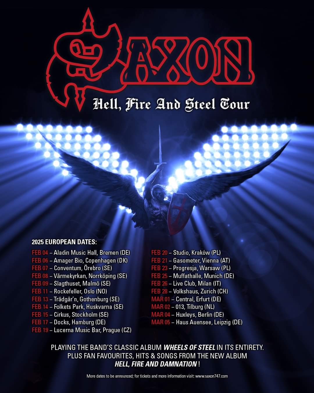 “The tour will see us perform our classic album ‘Wheels Of Steel’ in its entirety on what will be its 45th anniversary, plus all the hits, fan favorites and songs from our new album ‘Hell, Fire And Damnation’. This is a Saxon tour like no other and one you are not going to want to miss!”