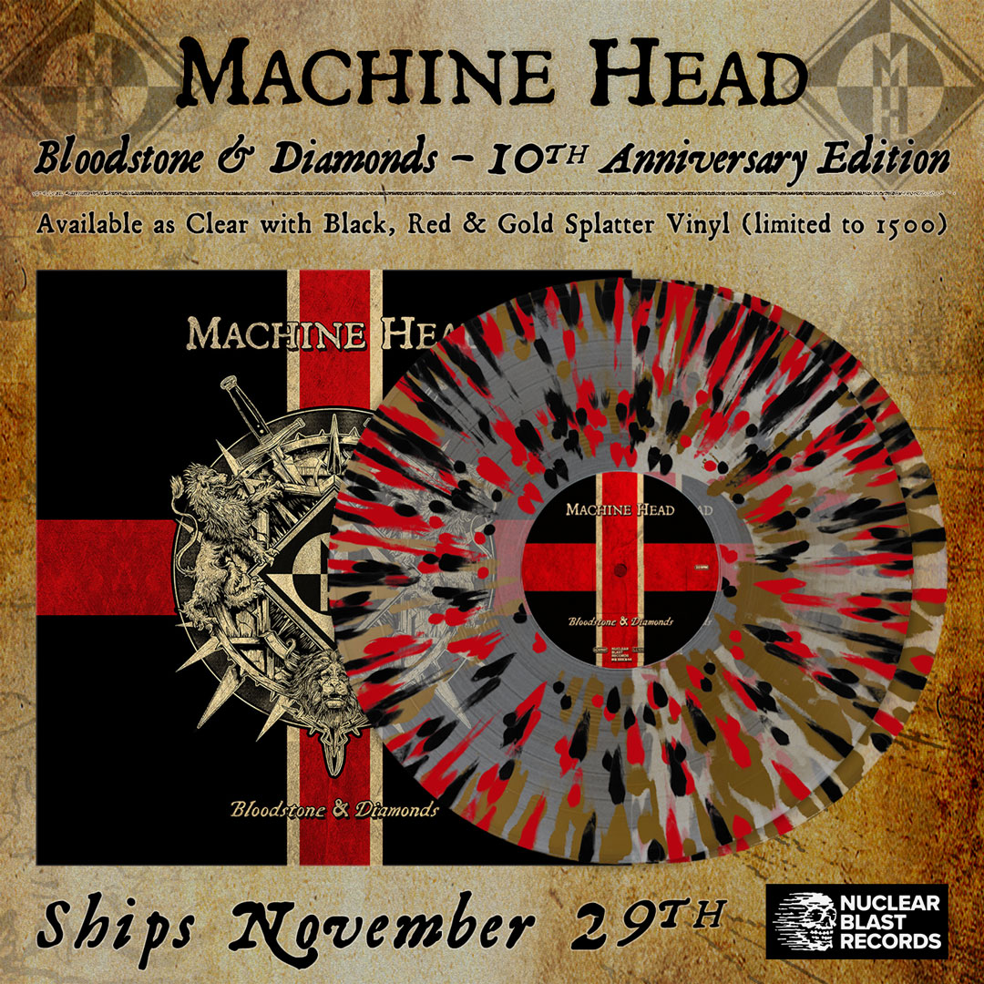 Machine Head will be releasing a 10th anniversary vinyl pressing of “Bloodstone & Diamonds” on November 29. Pre-orders can be found HERE. 1500 copies will be available on black, red, and gold splatter vinyl.