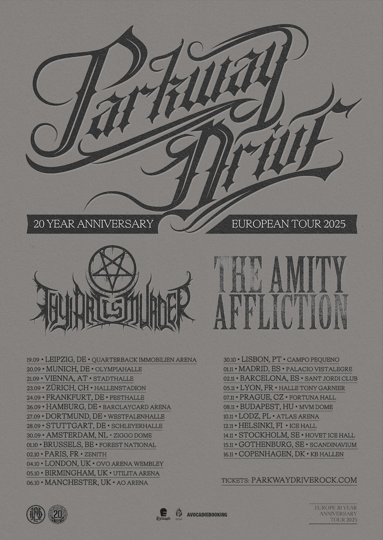 Parkway Drive have announced a 20th anniversary European/UK tour with Thy Art Is Murder and The Amity Affliction. Frontman Winston McCall commented: