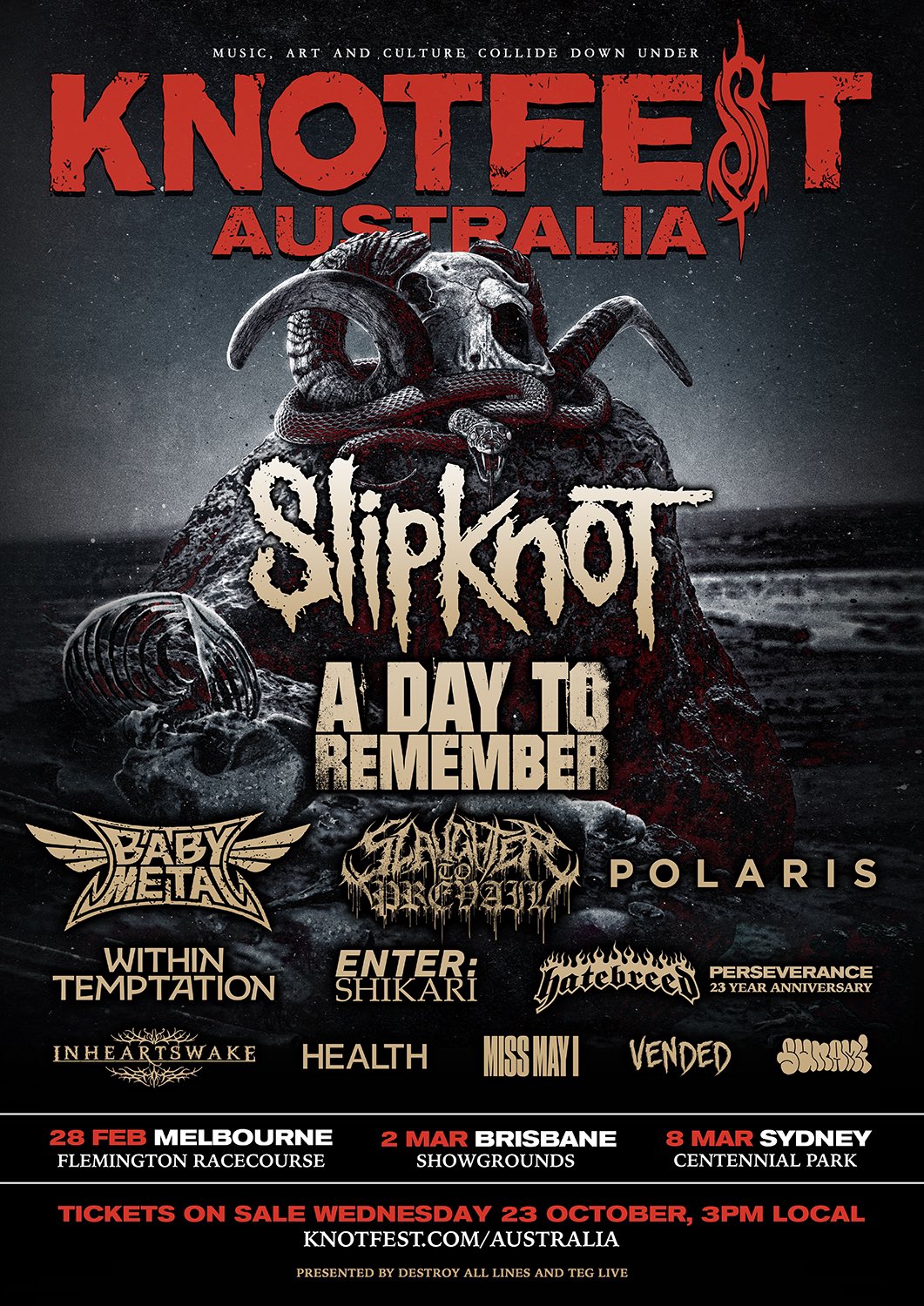 Slipknot have revealed the lineup for next year’s edition of Knotfest Australia. The festival will find the band joined by A Day To Remember, BABYMETAL, Slaughter To Prevail, Polaris, Within Temptation, Enter Shikari, Hatebreed, In Hearts Wake, HEALTH, Miss May I, Vended, and Sunami. The event is set to hit the following cities: