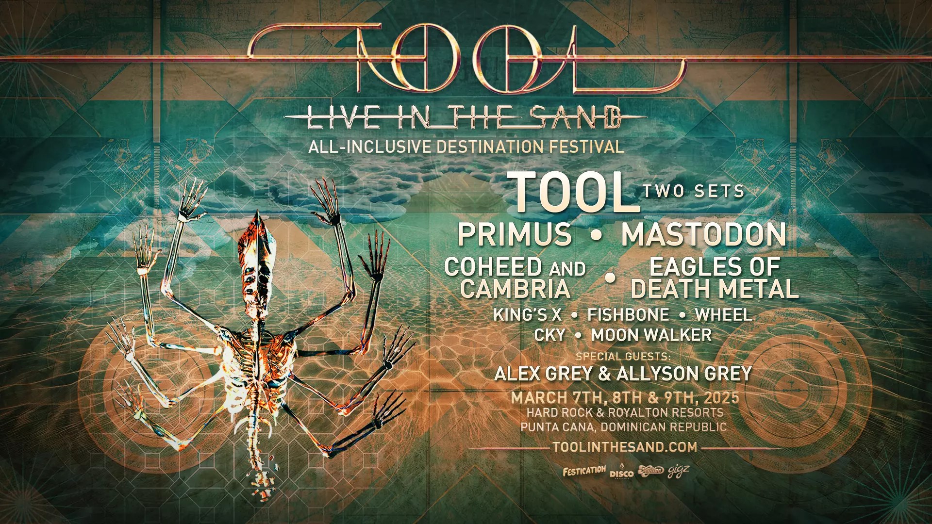 Tool have announced their first-ever “Tool Live In The Sand” festival. The event is set to take place at Punta Cana in the Dominican Republic on March 7-9 and it will also feature: Primus, Mastodon, Coheed And Cambria, Eagles Of Death Metal, King’s X, Fishbone, Wheel, CKY, and Moonwalker. Artists Alex and Allyson Grey will appear as well.