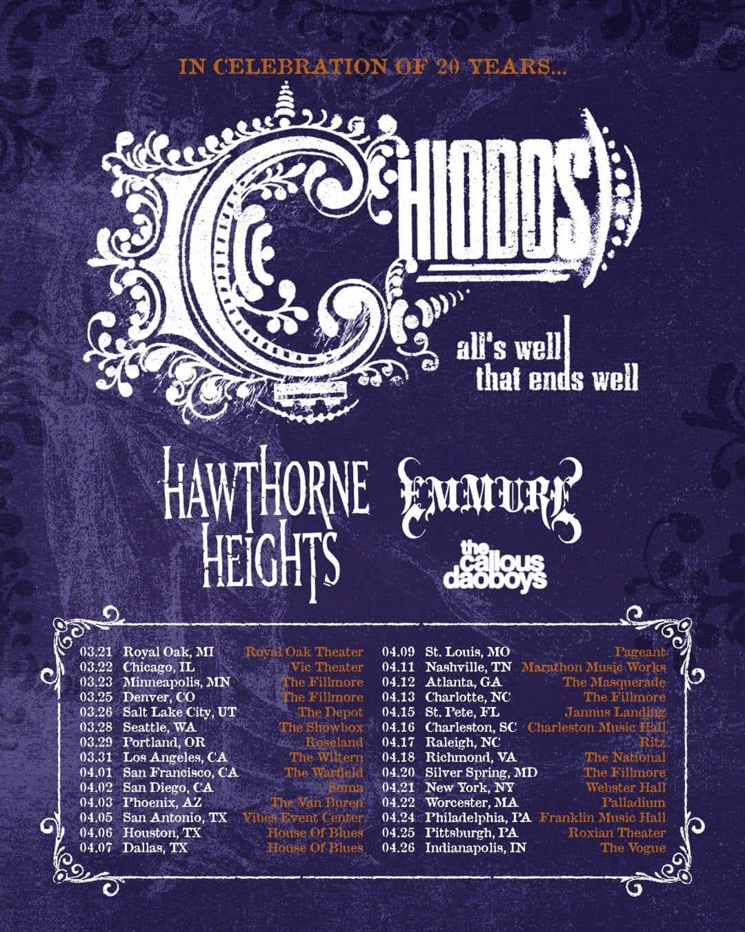 Chiodos have officially announced the dates for their “All’s Well That Ends Well” 20th anniversary tour. Hawthorne Heights, Emmure, and The Callous Daoboys will open.