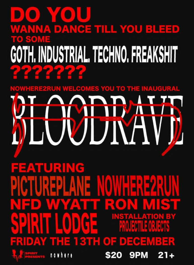 NOWHERE2RUN, the project featuring Code Orange’s Eric “Shade” Balderose and Jami Morgan, will be hosting their inaugural “Bloodrave” next month. The event will be held at the Spirit Lodge in Pittsburgh, PA on December 13 and it will find them joined by Pictureplane, NFD, Wyatt, and Ron Mist.