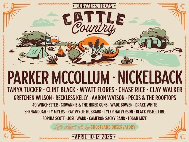 Nickelback will be co-headlining next year’s Cattle Country Festival. That event will be held in Gonzales, TX on April 10-12 and it will also feature: Parker McCollum, Tanya Tucker, Clint Black, Wyatt Flores, Chase Rice, Clay Walker, Gretchen Wilson, Reckless Kelly, Aaron Watson, etc.