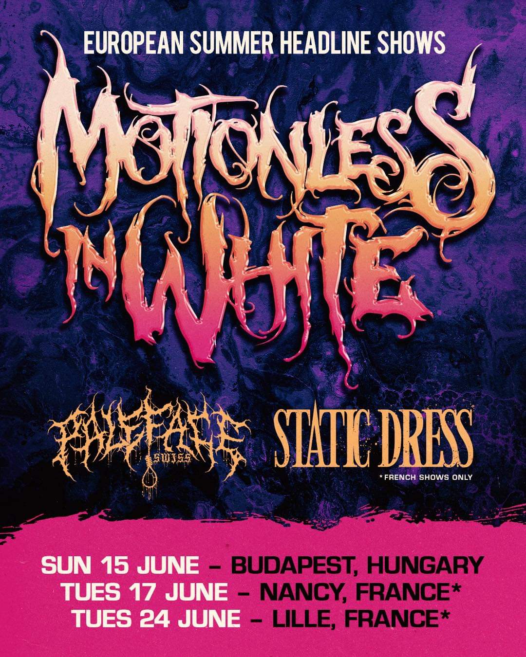 Motionless In White have announced a few European shows with Paleface Swiss and Static Dress. Here’s the dates: