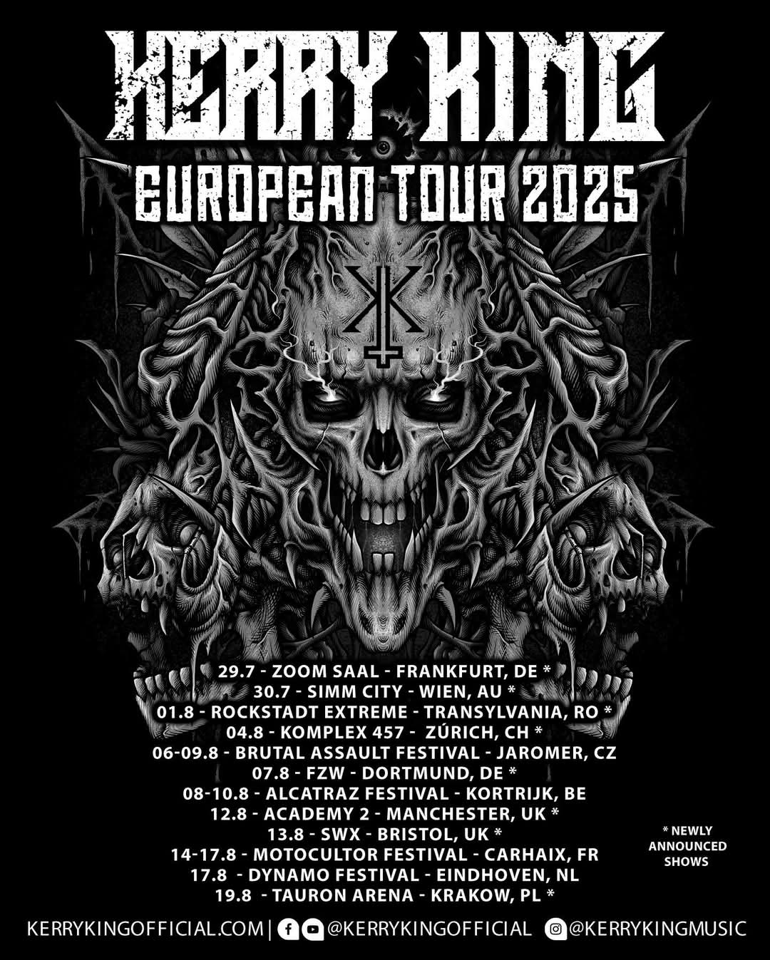 Slayer guitarist Kerry King and his solo band, vocalist Mark Osegueda (Death Angel), guitarist Phil Demmel (ex-Machine Head), bassist Kyle Sanders (HELLYEAH), and drummer Paul Bostaph (Slayer), have announced a summer 2025 European/UK tour. Here’s the dates: