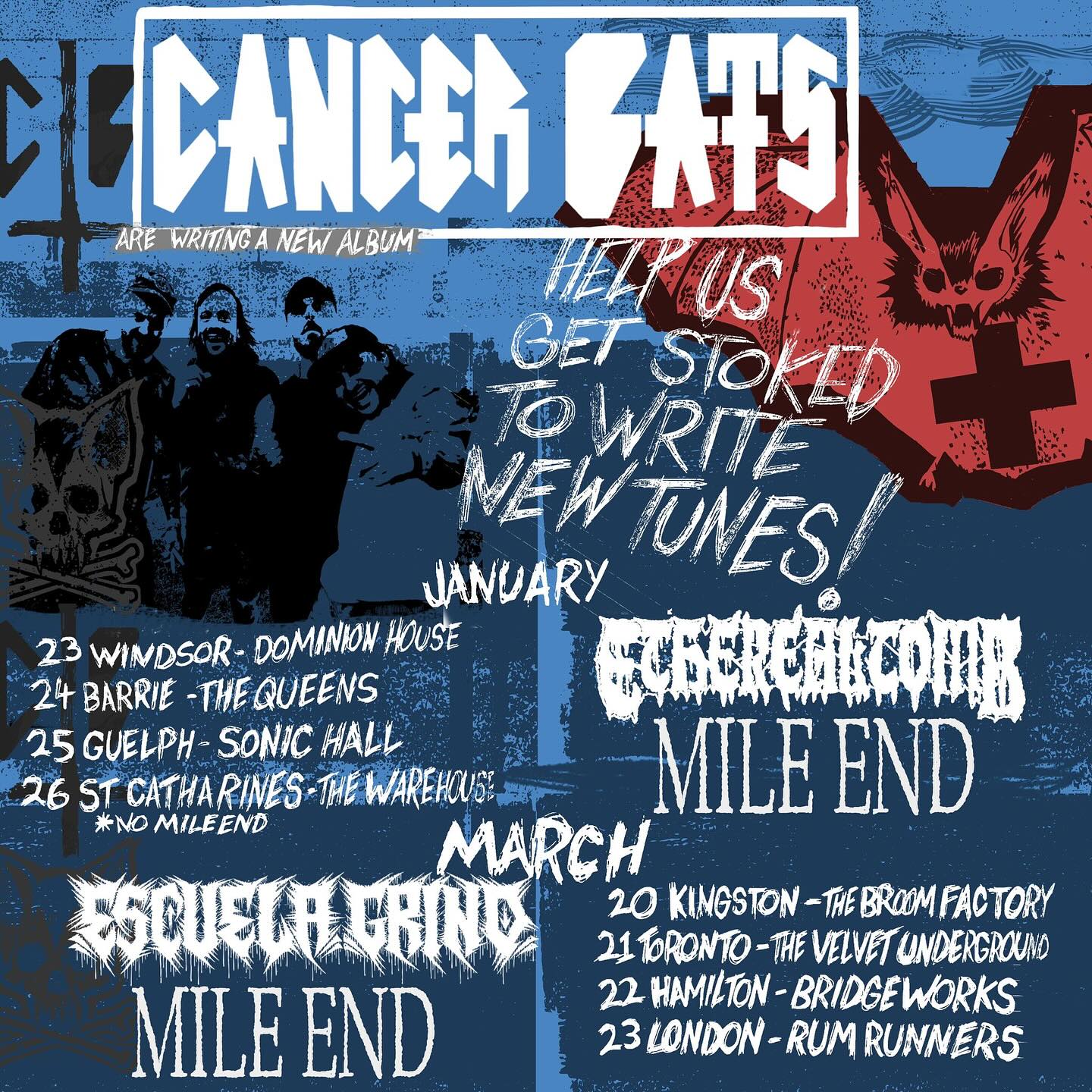 ONTARIO!!! We’re starting to work on new tunes for Album #8!!! We lined up these ripping shows to GET US STOKED TO WRITE NEW TUNES!!!! Along for the fun will be our amazing homies in @etherealtomb & @mileendband and in March @escuelagrind will be joining us for the rip!!! These shows are going to be the sweaty packed party inspiration to get us all fired up for a new record! Grab tickets and come rage!!!”