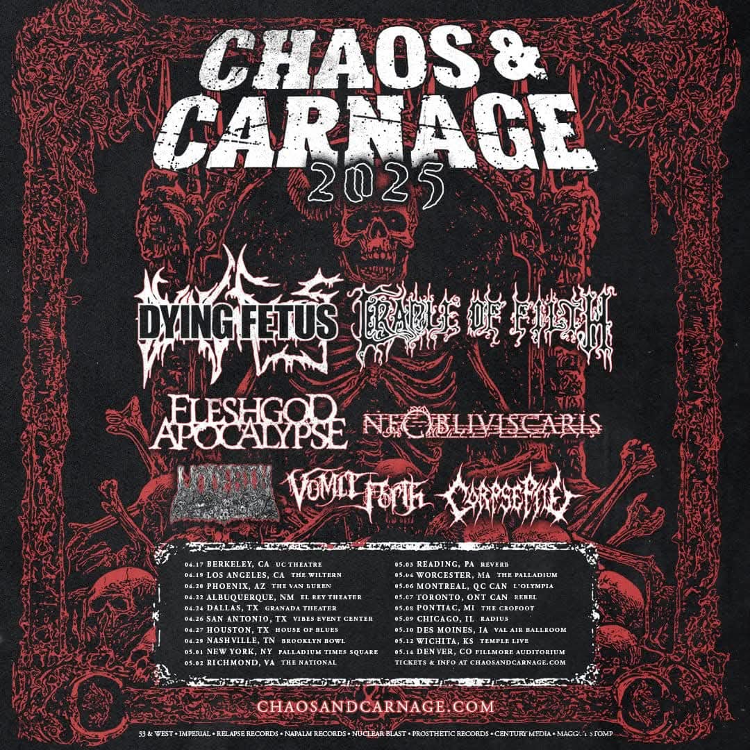 The lineup has officially been revealed for next year’s Chaos And Carnage Tour. The trek is scheduled to take place in the spring and it will feature the following: Dying Fetus, Cradle Of Filth, Fleshgod Apocalypse, Ne Obliviscaris, Undeath, Vomit Forth, and Corpse Pile.