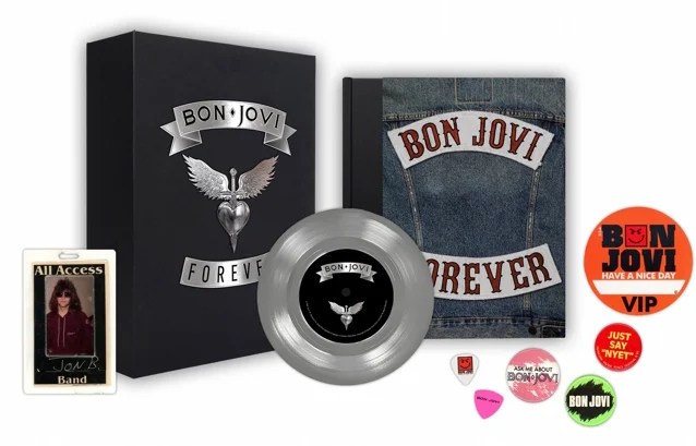Presented in a black clamshell box with a silver heart and dagger foiled on the front cover, the interior lining is printed in a colour montage of Bon Jovi tour passes and pins. The interior lid holds an exclusive 7” single. This chrome-coloured vinyl will present two specially selected recordings, which will be announced shortly.