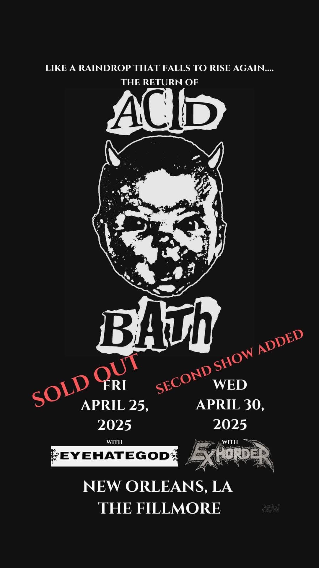 With the first date having sold out, Acid Bath have decided to book another show at The Fillmore in New Orleans, LA. The band are now set to perform at the venue on April 25 and April 30. Here’s their updated schedule: