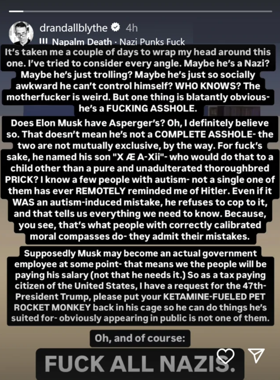 Lamb Of God frontman Randy Blythe has blasted Elon Musk over a controversial gesture he made during the presidential inauguration for convicted felon Donald Trump. Musk has been receiving backlash for the motion, which many viewed as an obvious Nazi salute. For his part, Blythe responded by calling the billionaire “a fucking asshole.”