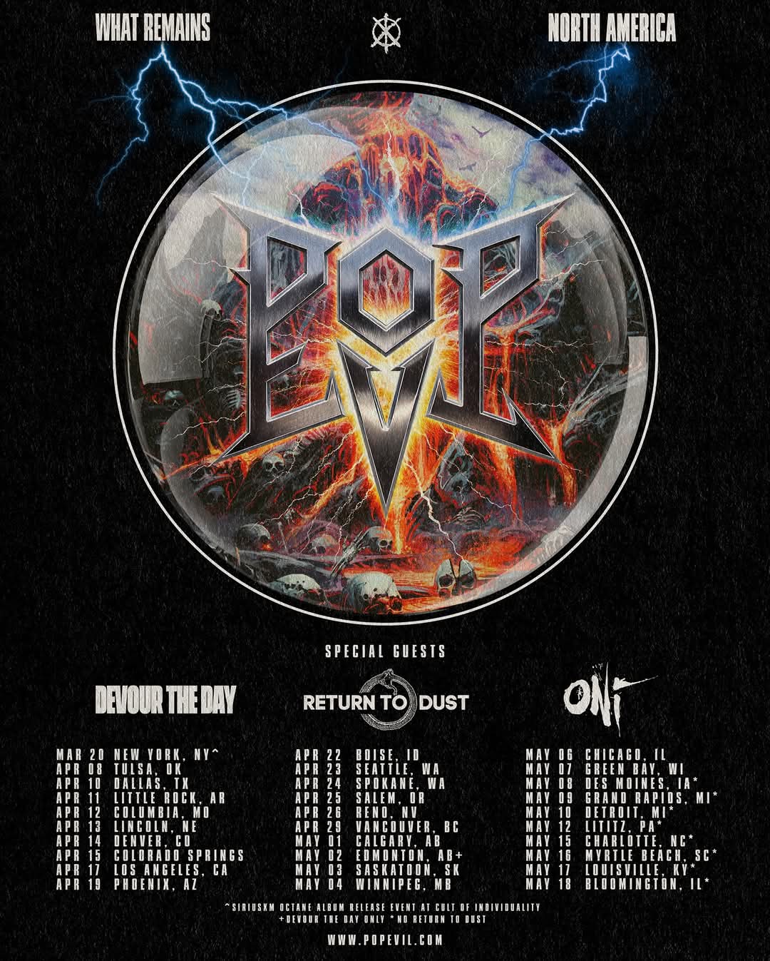 Pop Evil have announced a North American tour in support of their new album “What Remains” (out March 21). Devour The Day, Return To Dust, and Oni will open.