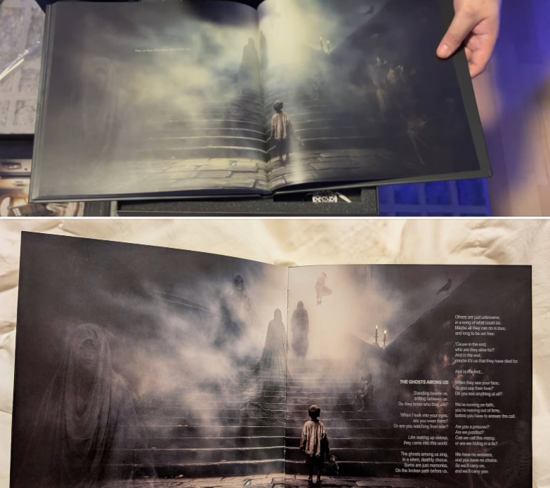 “Is this for real?! A piece of artwork in the new Dream Theater deluxe edition is the EXACT same piece of artwork that was in ‘The Lightbringers’ booklet for the song ‘The Ghosts Among Us.’ I’m sure they won’t read this, but any thoughts from Mike Portnoy or John Petrucci? Hugh Syme did the artwork for my album and theirs, so I think I can see where this is going…”