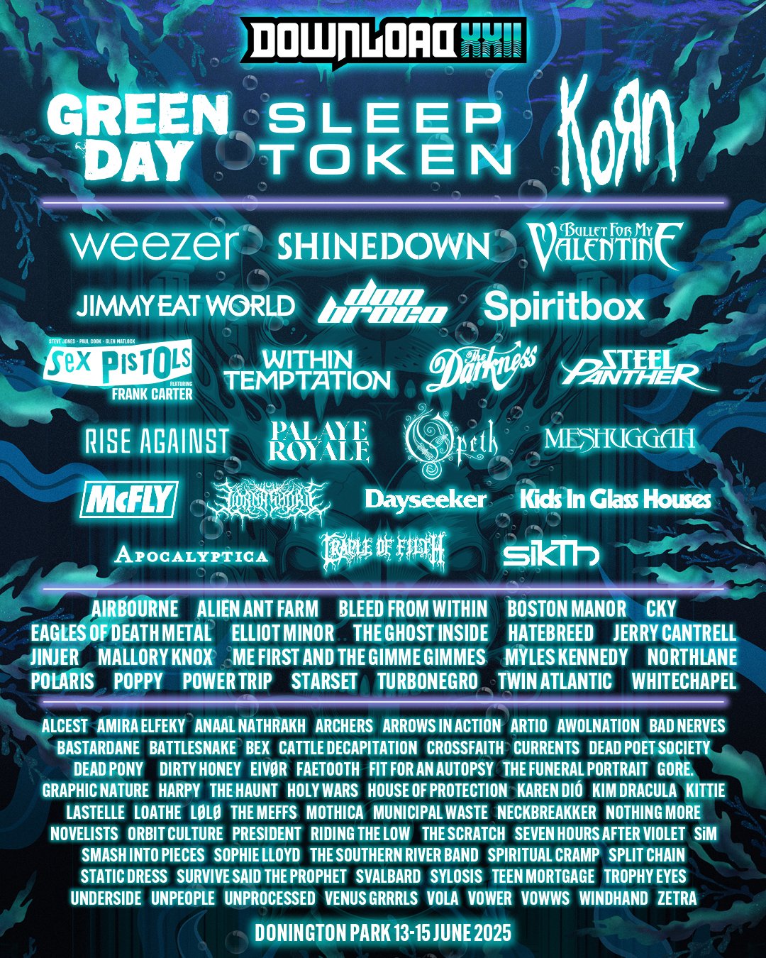22 more artists have been added to this year’s Download Festival. The event will take place at Donington Park in Derby, UK on June 13-15 and it will now feature the following: Green Day, Sleep Token, Korn, Weezer, Shinedown, Bullet For My Valentine, Jimmy Eat World, Don Broco, Spiritbox, Sex Pistols with Frank Carter (The Rattlesnakes), Within Temptation, The Darkness, Steel Panther, Rise Against, Palaye Royale, Opeth, Meshuggah, McFly, Lorna Shore, Dayseeker, Kids In Glass Houses, Apocalyptica, Cradle Of Filth, SikTh, Airbourne, Alien Ant Farm, Bleed From Within, Boston Manor, CKY, Eagles Of Death Metal, Elliot Minor, The Ghost Inside, Hatebreed, Jerry Cantrell, Jinjer, Mallory Knox, Me First And The Gimme Gimmes, Myles Kennedy (Alter Bridge), Northlane, Polaris, Poppy, Power Trip, Starset, Turbonegro, Twin Atlantic, Whitechapel, Alcest, Amira Elfeky, Anaal Nathrakh, Archers, Arrows In Action, Artio, AWOLNATION, Bad Nerves, Bastardane, Battlesnake, Bex, Cattle Decapitation, Crossfaith, Currents, Dead Poet Society, Dead Pony, Dirty Honey, Eivor, Faetooth, Fit For An Autopsy, The Funeral Portrait, Gore., Graphic Nature, Harpy, The Hanut, Holy Wars, House Of Protection, Karen Dió, Kim Dracula, Kittie, Lastelle, Loathe, L0L0, The Meffs, Mothica, Municipal Waste, Neckbreakker, Nothing More, Novelists, Orbit Culture, President, Riding The Low, The Scratch, Seven Hours After Violet, SiM, Smash Into Pieces, Sophie Lloyd, The Southern River Band, Spiritual Cramps, Split Chain, Static Dress, Survive Said The Prophet, Svalbard, Sylosis, Teen Mortgage, Trophy Eyes, Underside, Unpeople, Unprocessed, Venus Grrrls, Vola, Vower, Vowws, Windhand, and Zetra. Tickets can be found HERE.