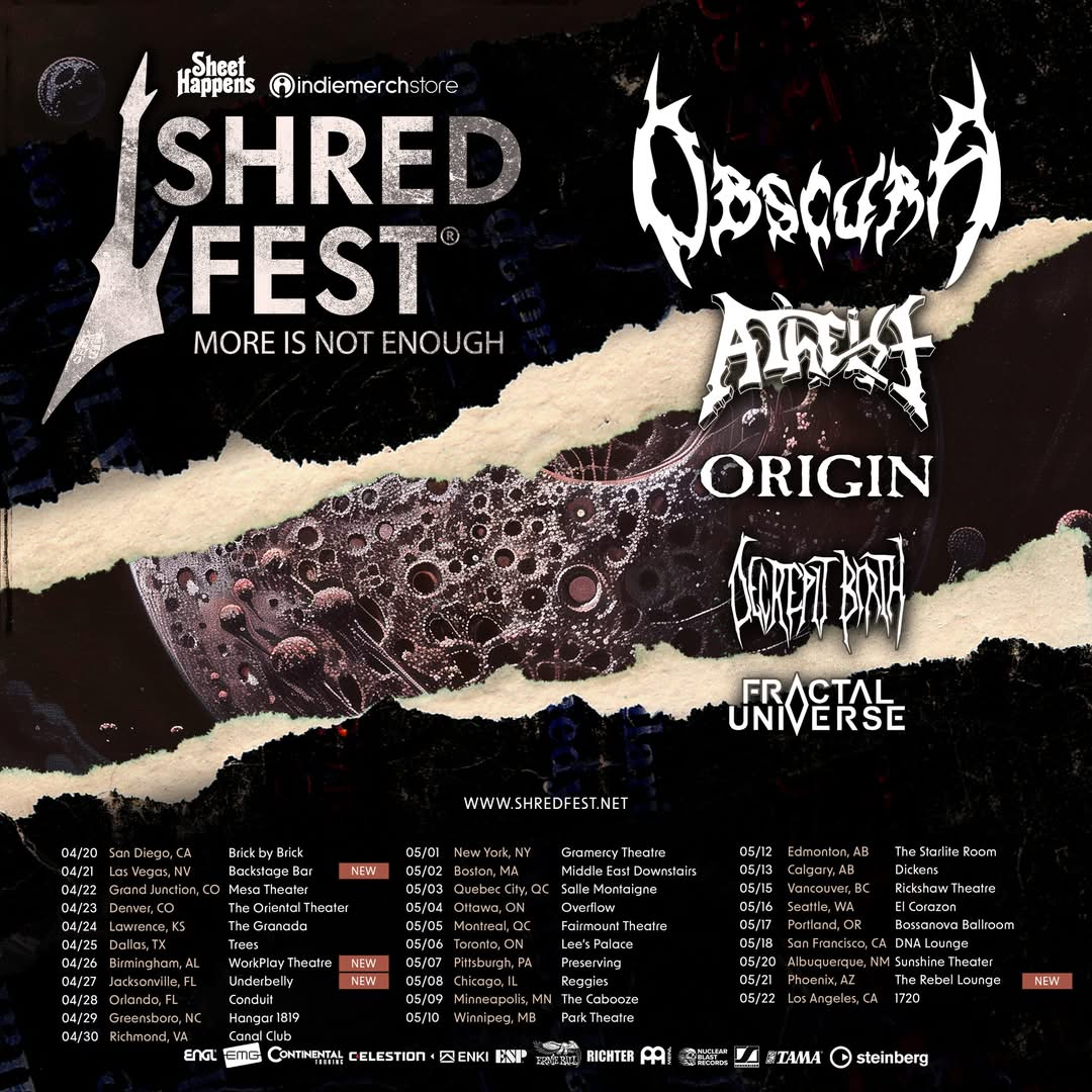 Obscura, Atheist, Origin, Decrepit Birth, and Fractal Universe have added four more dates to their upcoming “Shred Fest” tour. This includes new stops in Las Vegas, NV, Birmingham, AL, Jacksonville, FL, and Phoenix, AZ.