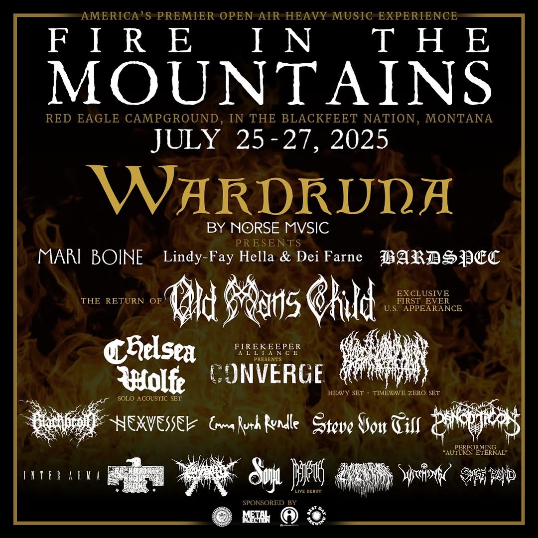 More bands have been added to this year’s Fire In The Mountains festival. The event will take place at the Red Eagle Campground in Glacier, MT on July 25-27 and it will now feature the following: Wardruna, By Norse Curation (featuring: Mari Boine, Lindy-Fay Hella & Dei Farne, and BardSpec) Old Mans Child, Chelsea Wolfe (solo acoustic set), Converge, Blood Incantation (“Timewave Zero” and heavy set), Blackbraid, Hexvessel, Emma Ruth Rundle, Steve Von Till, Panopticon (performing “Autumn Eternal“), Inter Arma, Pan-Amerikan Native Front, Tzompantli, Sonja, Majesties, Lilith, Witching, and Sage Bond.