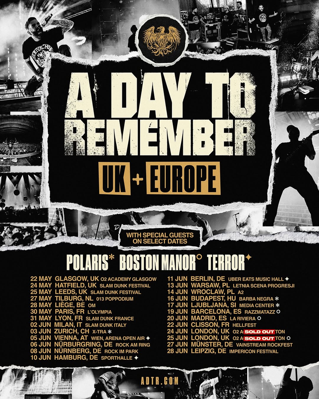 A Day To Remember have announced a European/UK tour. Polaris, Boston Manor, and Terror will open on select dates.