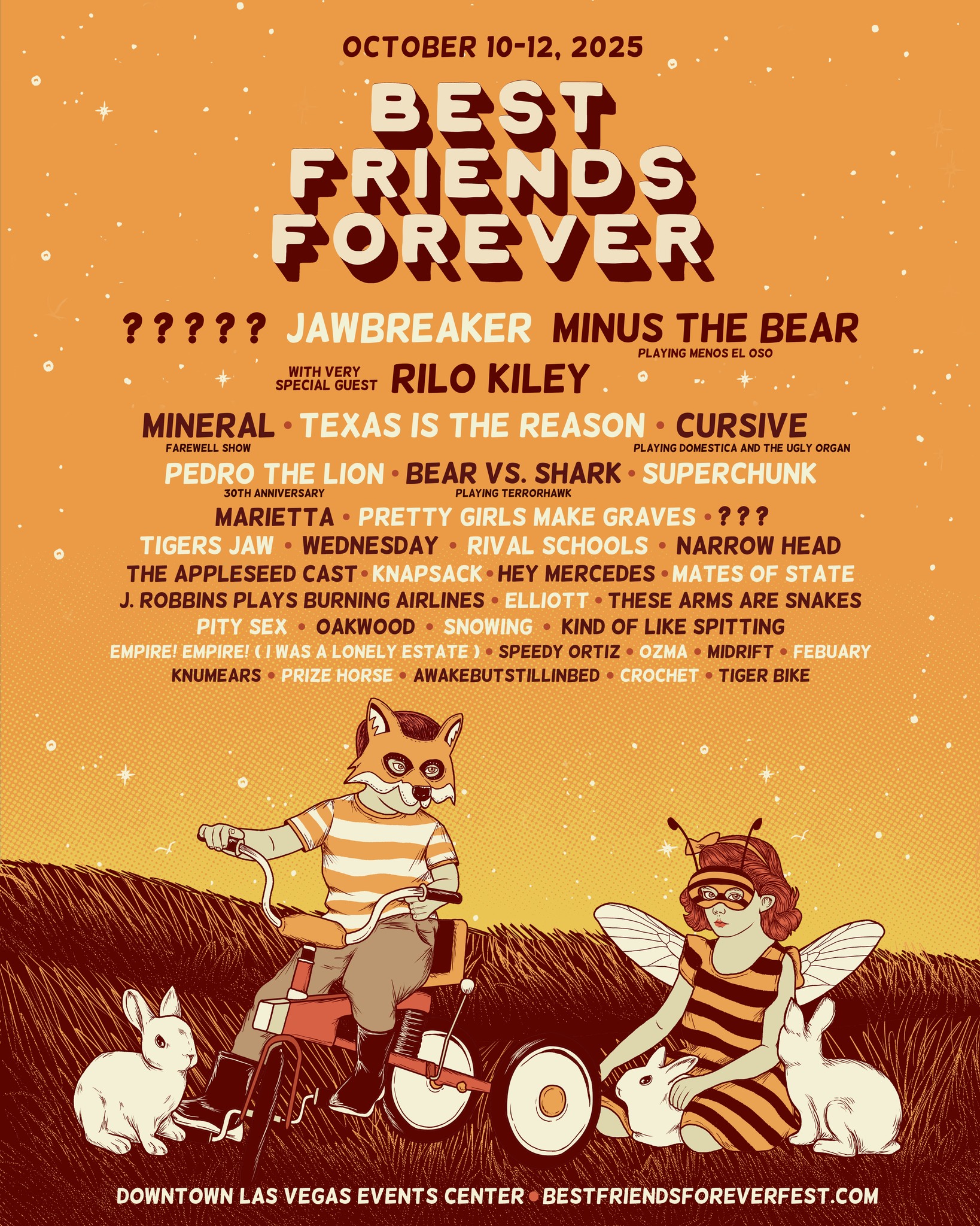 The initial lineup has been revealed for this year’s Best Friends Forever festival. The event will take place at the Downtown Las Vegas Events Center in Las Vegas, NV on October 10-12 and it will feature the following: Jawbreaker, Minus The Bear (performing “Menos el Oso“), Rilo Kiley, Mineral (farewell show), Texas Is The Reason, Cursive (performing “Domestica” & “The Ugly Organ“), Pedro The Lion (30th anniversary show), Bear Vs. Shark (performing “Terrorhawk“), Superchunk, Marietta, Pretty Girls Make Graves, Tigers Jaw, Wednesday, Rival Schools, Narrow Head, The Appleseed Cast, Knapsack, Hey Mercedes, Mates Of State, J. Robbins Plays Burning Airlines, Elliott, These Arms Are Snakes, Pity Sex, Oakwood, Snowing, King Of Like Spitting, Empire! Empire! (I Was A Lonely Estate), Speedy Ortiz, Ozma, Midrift, February, Knumears, Prize Horse, Awakebustillinbed, Crochet, and Tiger Bike.