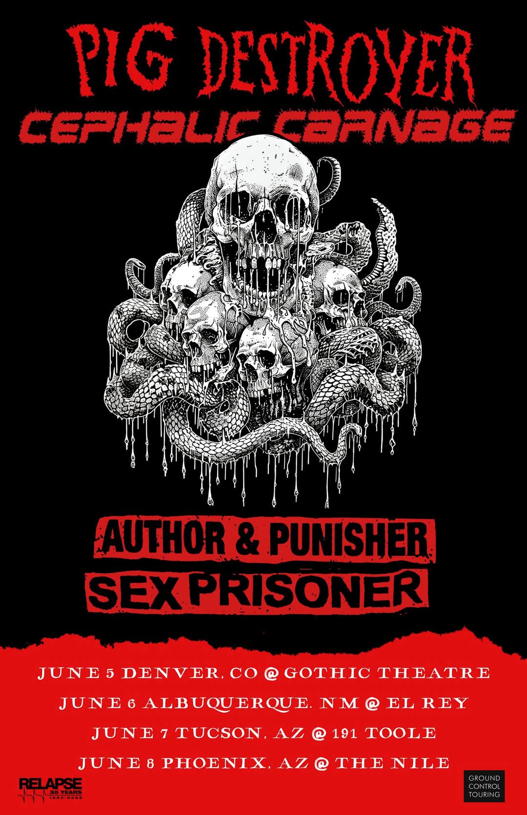 Pig Destroyer, Cephalic Carnage, Author & Punisher, and Sex Prisoner have announced some June U.S. shows. Here’s the dates: